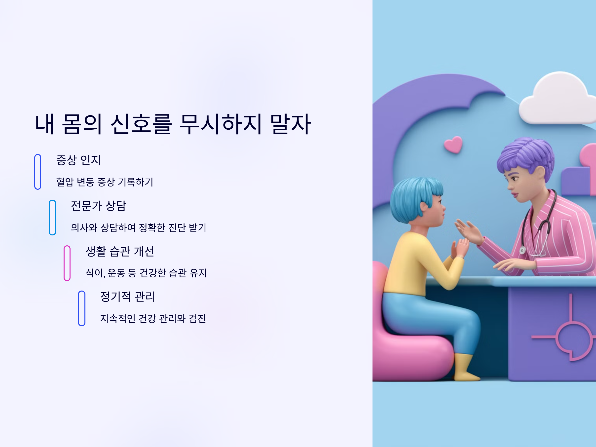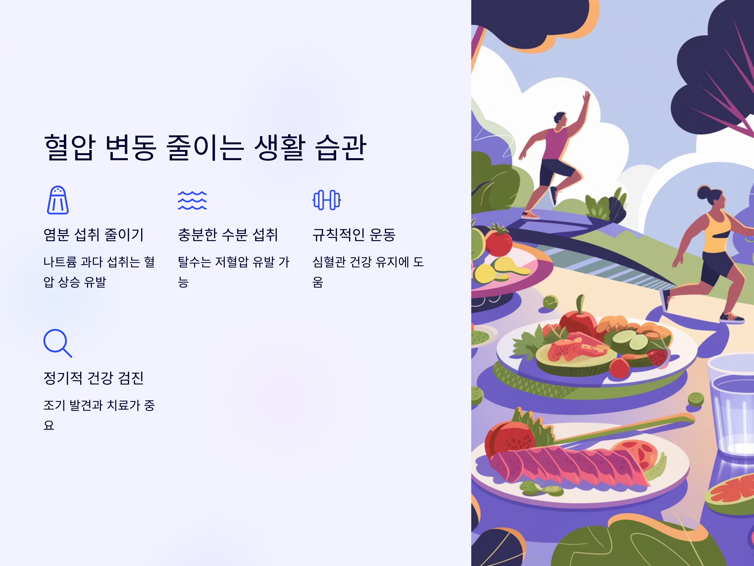 - 규칙적인 운동: 심혈관 건강을 유지하고 혈압 조절 능력을 향상시킵니다.