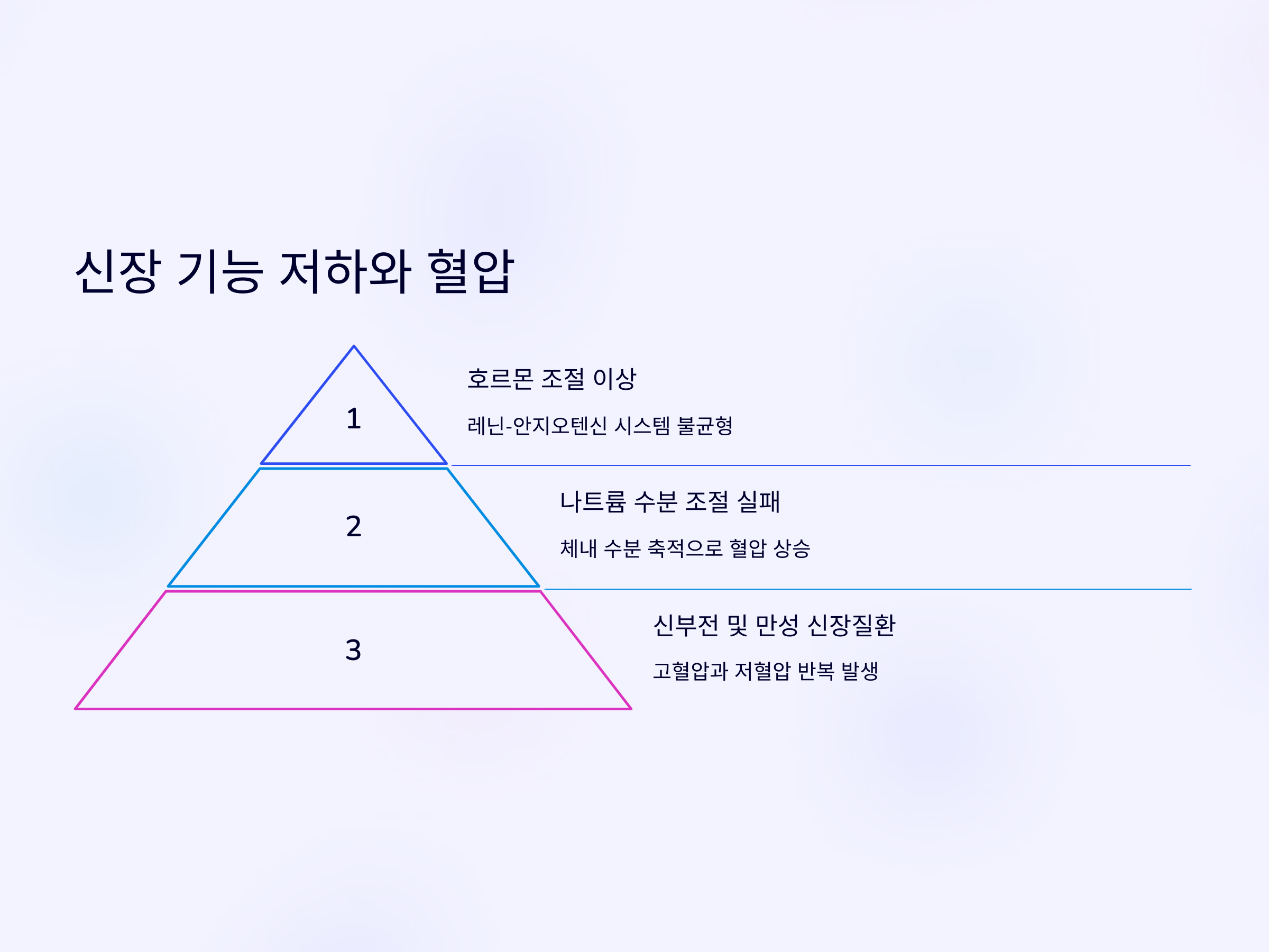 - 나트륨과 수분 조절 실패: 신장이 나트륨과 수분을 제대로 배출하지 못하면 혈압이 높아질 수 있습니다.