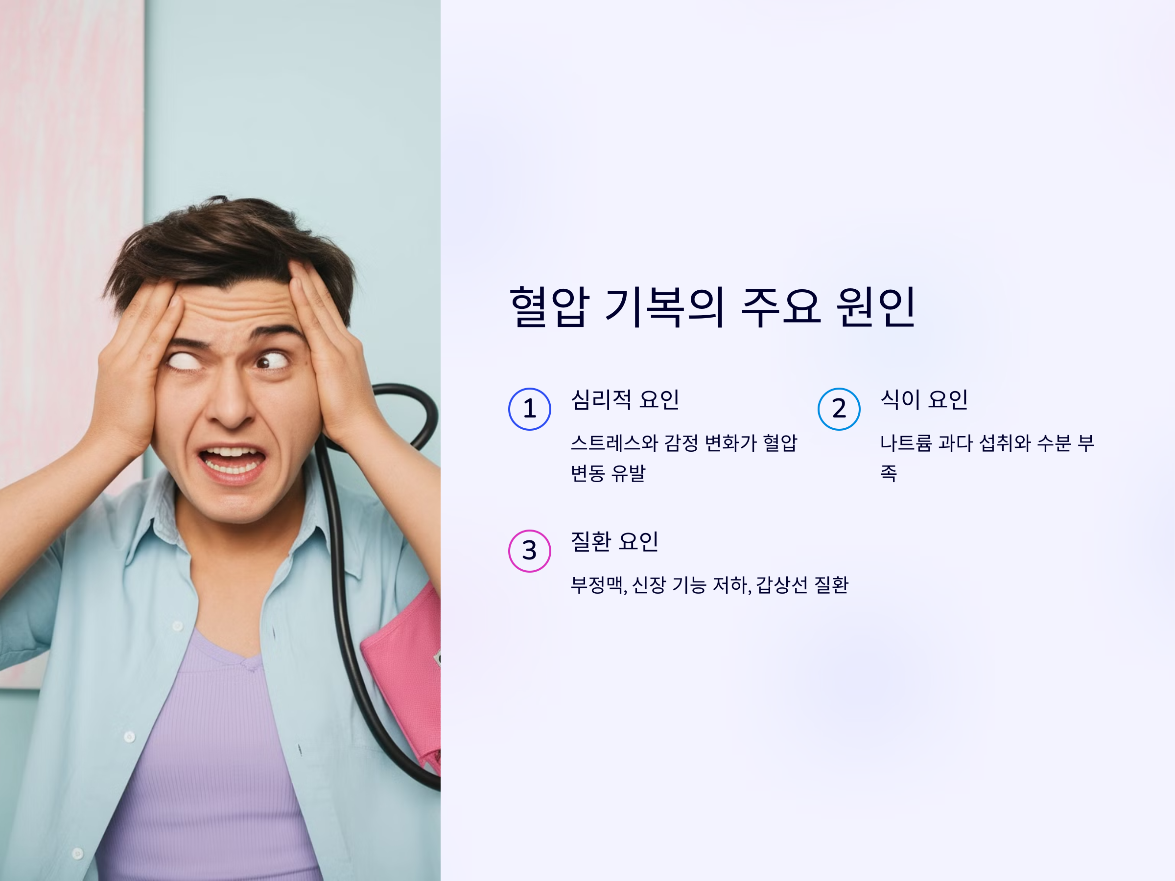 - 기타 질환(갑상선 질환, 당뇨 등): 내분비계 문제도 혈압 변동의 원인이 될 수 있습니다.