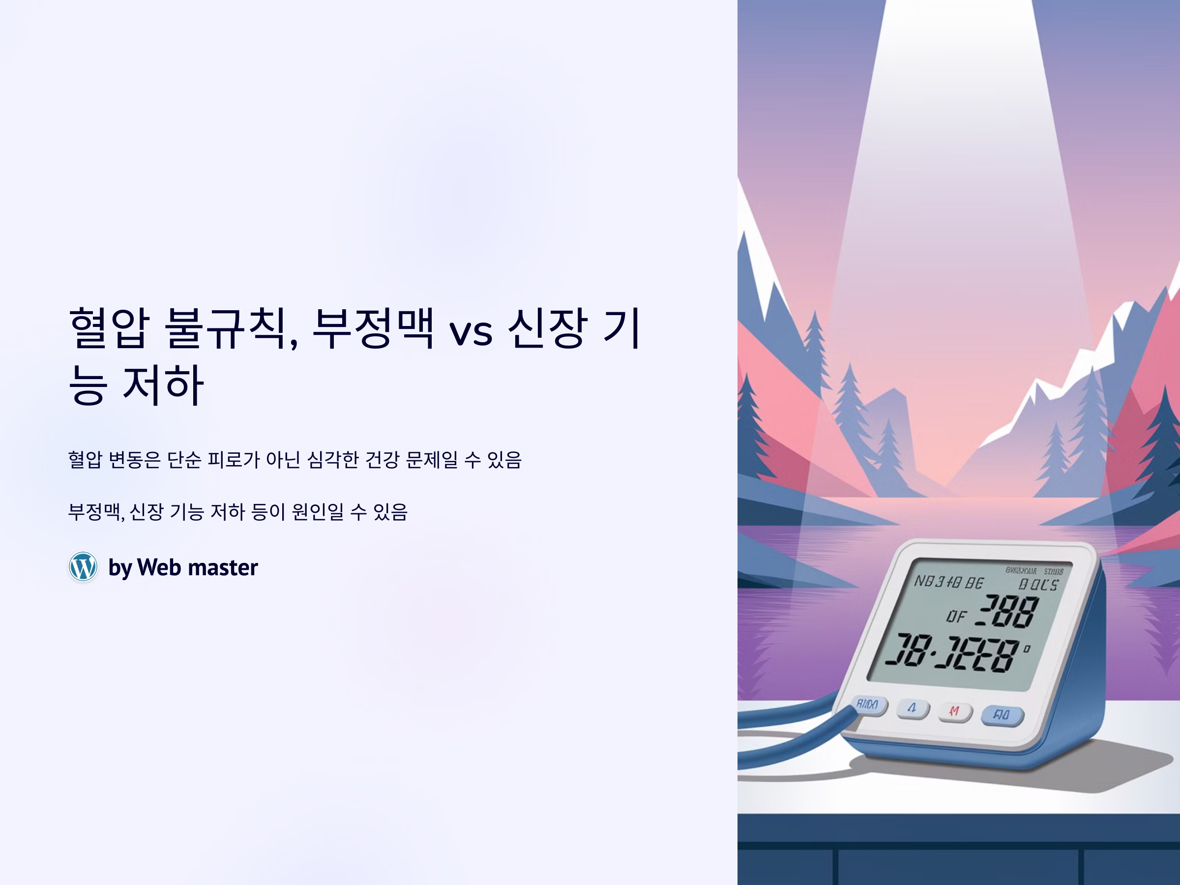 혈압이 일정하지 않고 기복이 심한 증상을 경험하는 사람들이 많습니다. 하지만 이를 단순한 피로나 스트레스 탓으로 돌리기에는 위험할 수 있습니다. 혈압의 급격한 변동은 부정맥이나 신장 기능 저하와 같은 심각한 건강 문제와 관련될 수 있기 때문입니다. 이번 글에서는 혈압 변동의 원인을 분석하고, 부정맥과 신장 기능 저하 중 어느 것이 원인일 가능성이 높은지, 그리고 어떻게 대처해야 하는지를 자세히 알아보겠습니다.