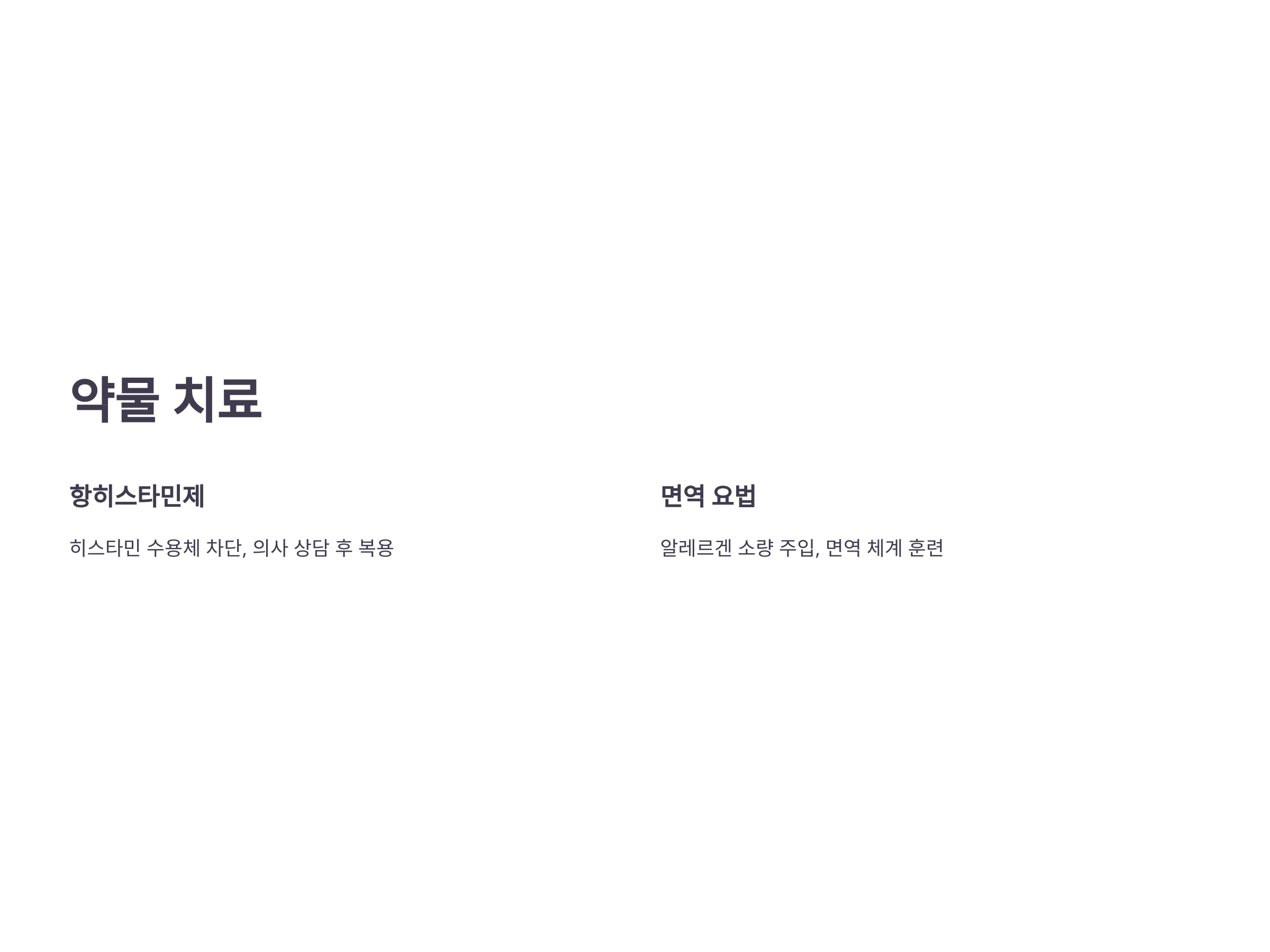 코 막힘과 눈 가려움 증상을 완화하기 위해, 항히스타민제를 사용할 수 있습니다. 이 약물은 면역 시스템의 과도한 반응을 억제하여 증상을 줄여줍니다. 또한, 코막힘을 완화하는 비강 스프레이나 눈 가려움 증상을 완화하는 인공눈물도 효과적입니다.