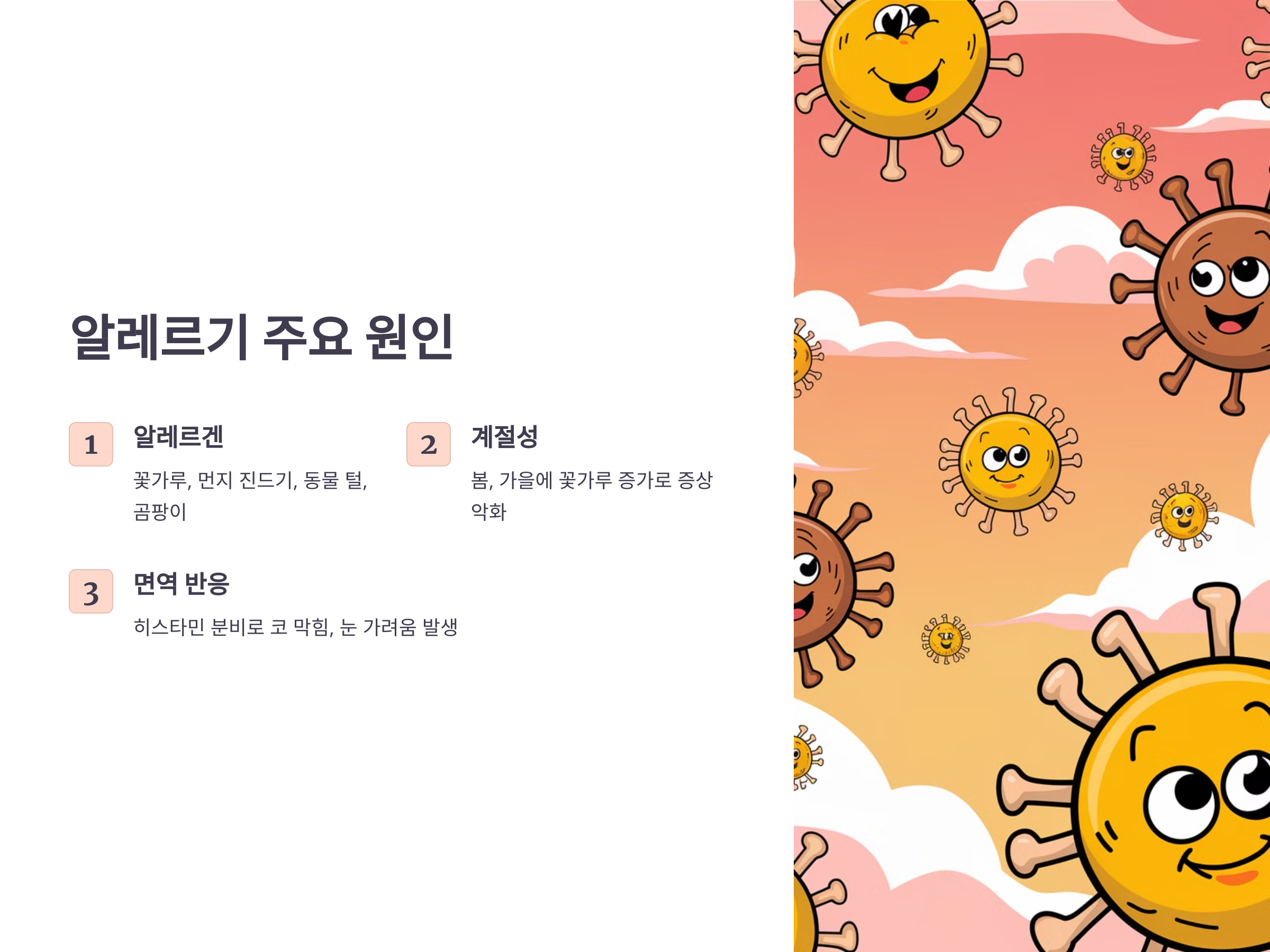 알레르겐이 체내에 들어오면, 면역 체계는 이를 '위험한 물질'로 잘못 인식하고 히스타민 등의 화학 물질을 분비하게 됩니다. 이로 인해 코가 막히고, 눈이 가려운 증상이 발생하는 것이죠.