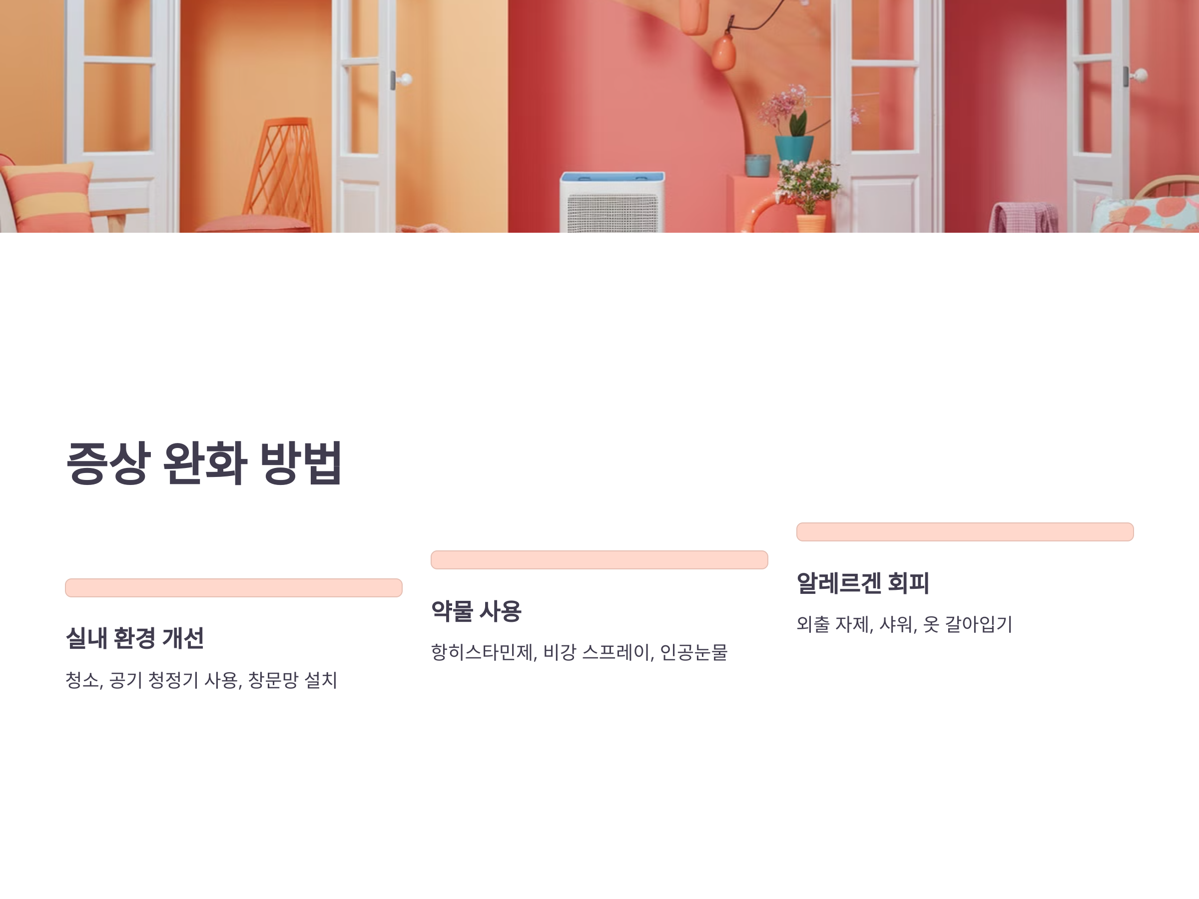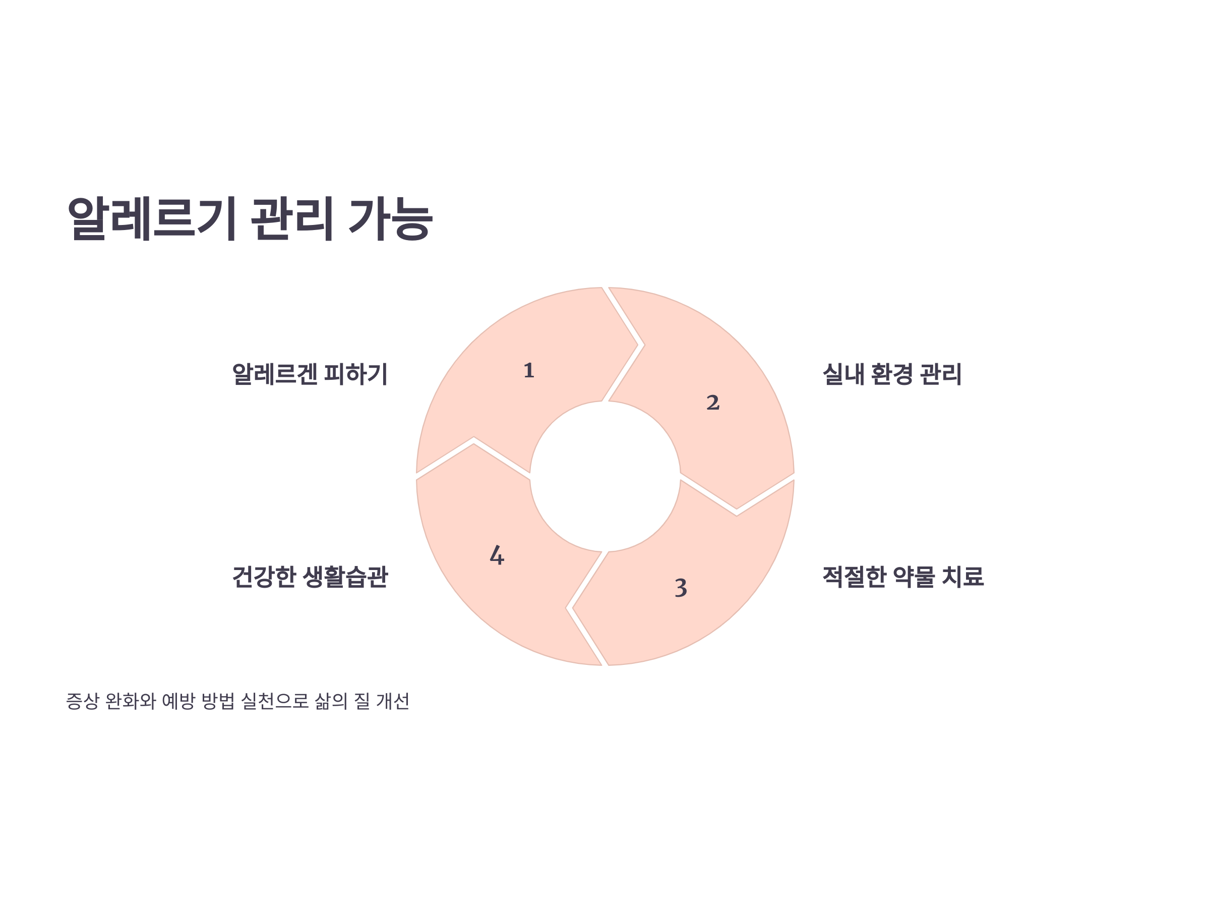 가장 중요한 방법은 알레르겐과의 접촉을 최소화하는 것입니다. 실내 환경을 깨끗하게 유지하고, 외출 후에는 반드시 옷을 갈아입는 등의 조치를 취하는 것이 좋습니다.