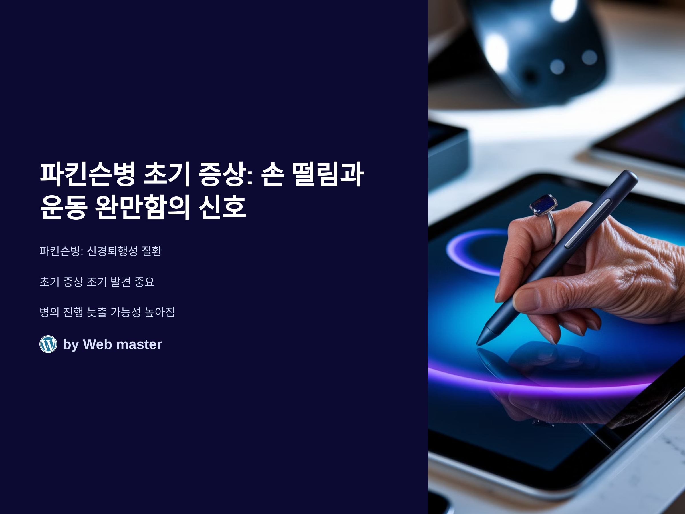 파킨슨병은 신경퇴행성 질환 중 하나로, 초기에는 미묘한 증상으로 시작되지만 점차 일상생활에 영향을 미치게 됩니다. 대표적인 초기 증상으로는 손 떨림(진전), 운동 완만(운동 저하), 근육 경직 등이 있으며, 이를 조기에 발견하는 것이 중요합니다. 최근 연구에 따르면 초기 증상을 빨리 알아차리고 적절한 치료를 시작하면 병의 진행을 늦출 수 있는 가능성이 높아지고 있습니다. 이 글에서는 파킨슨병의 초기 증상을 세부적으로 살펴보고, 조기 진단의 중요성과 치료법에 대해 알아보겠습니다.