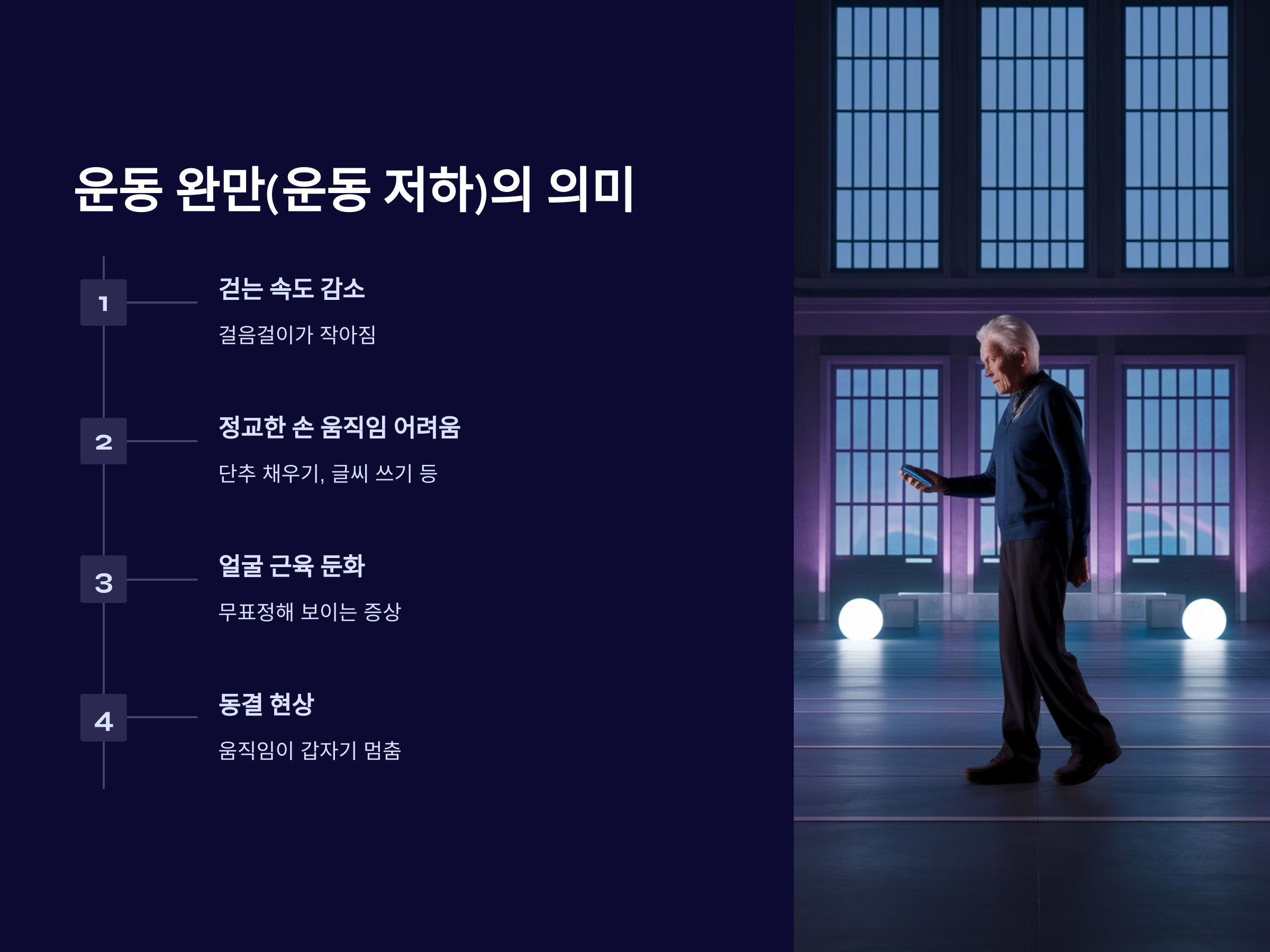 파킨슨병의 또 다른 대표적인 초기 증상은 운동 완만(브래디키네시아, bradykinesia)입니다. 이는 몸의 움직임이 둔해지고, 일상적인 동작이 느려지는 현상을 의미합니다.