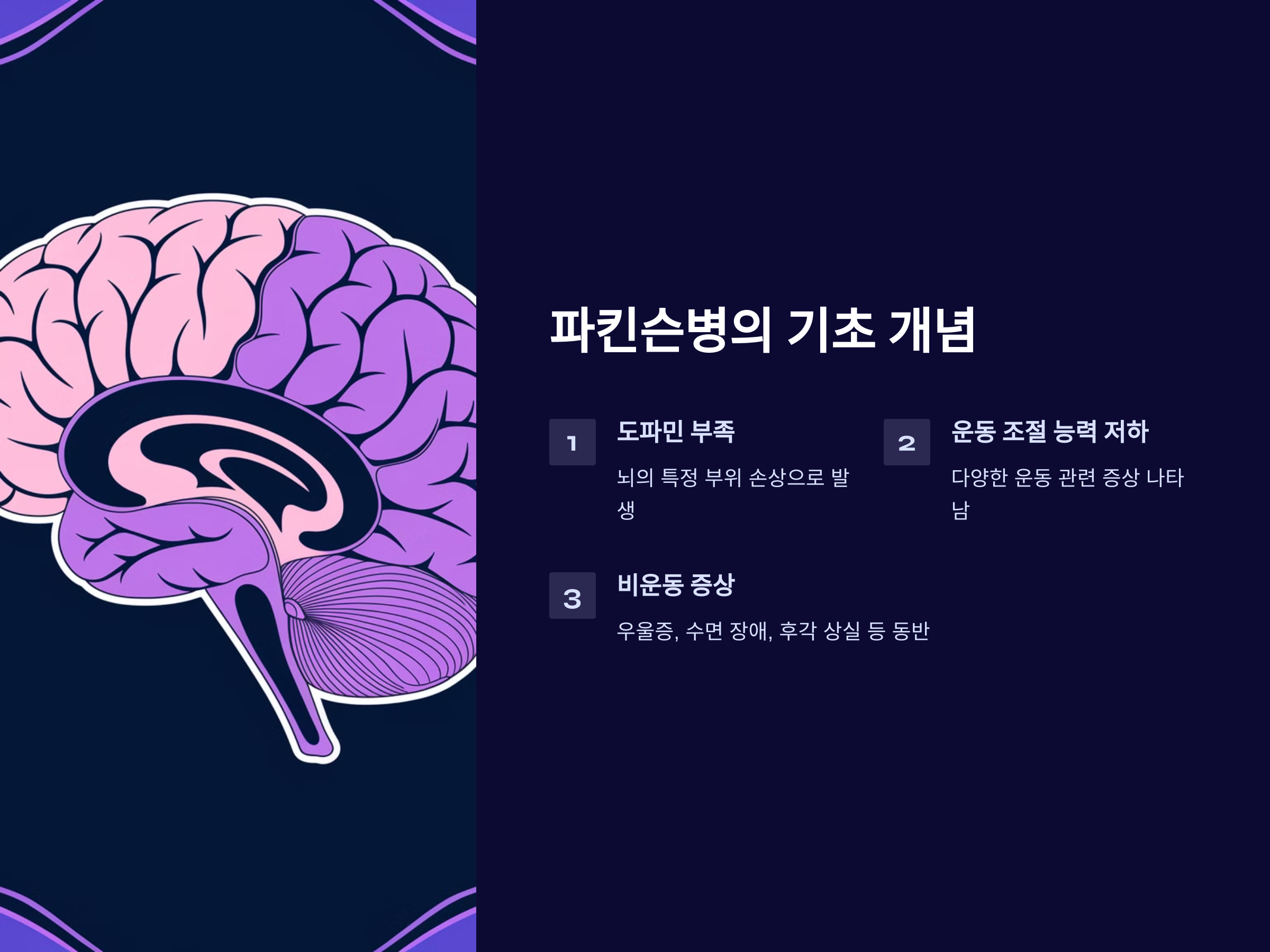 파킨슨병은 도파민이라는 신경전달물질을 생성하는 뇌의 특정 부위(흑질, 기저핵 등)가 점진적으로 손상되면서 발생하는 만성 신경퇴행성 질환입니다. 주로 60세 이상에서 많이 발생하지만, 최근에는 40~50대에서도 발병 사례가 증가하고 있습니다.