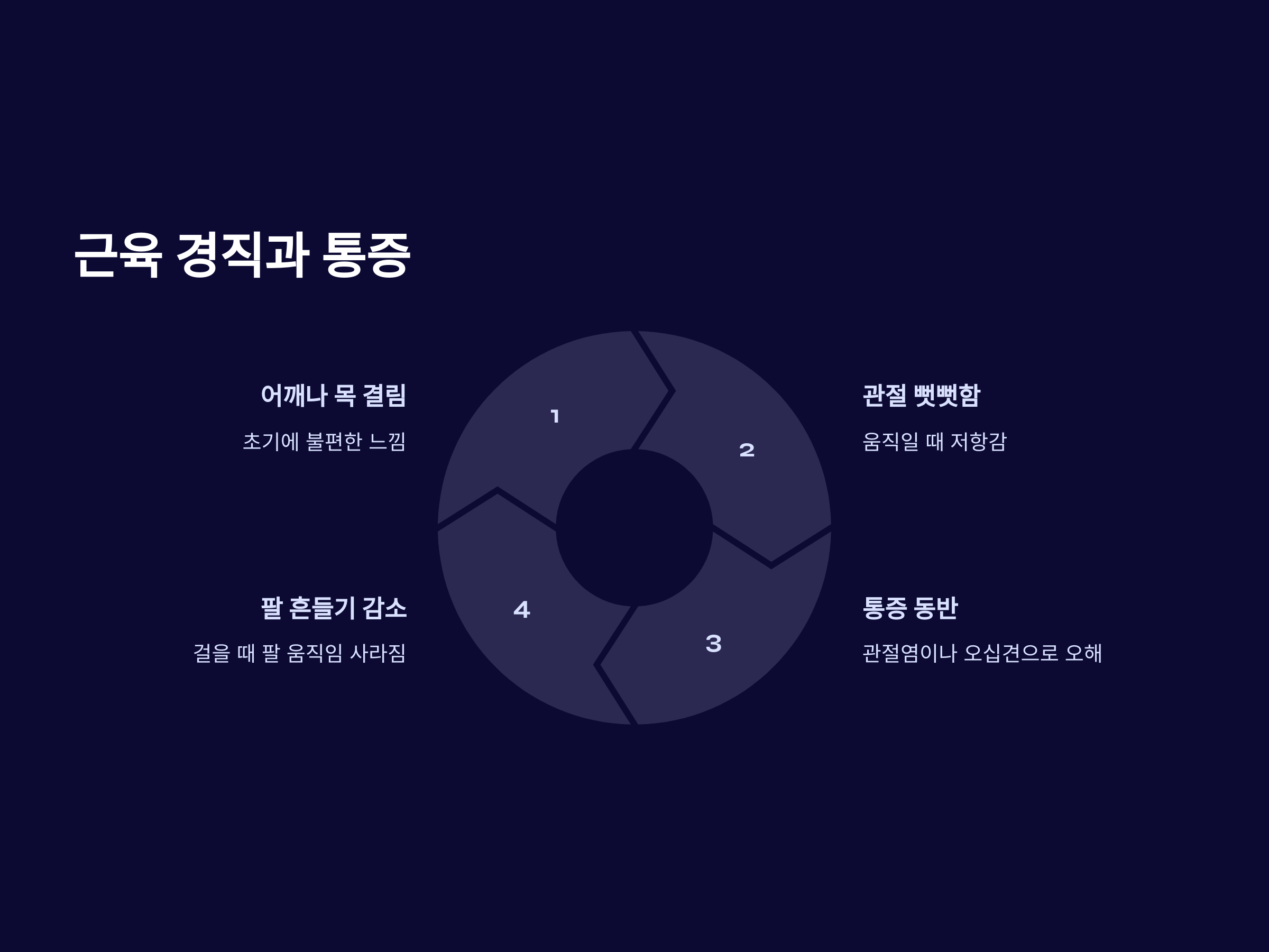 - 근육이 경직되면서 통증을 동반할 수도 있으며, 관절염이나 오십견으로 오해하는 경우도 많습니다.