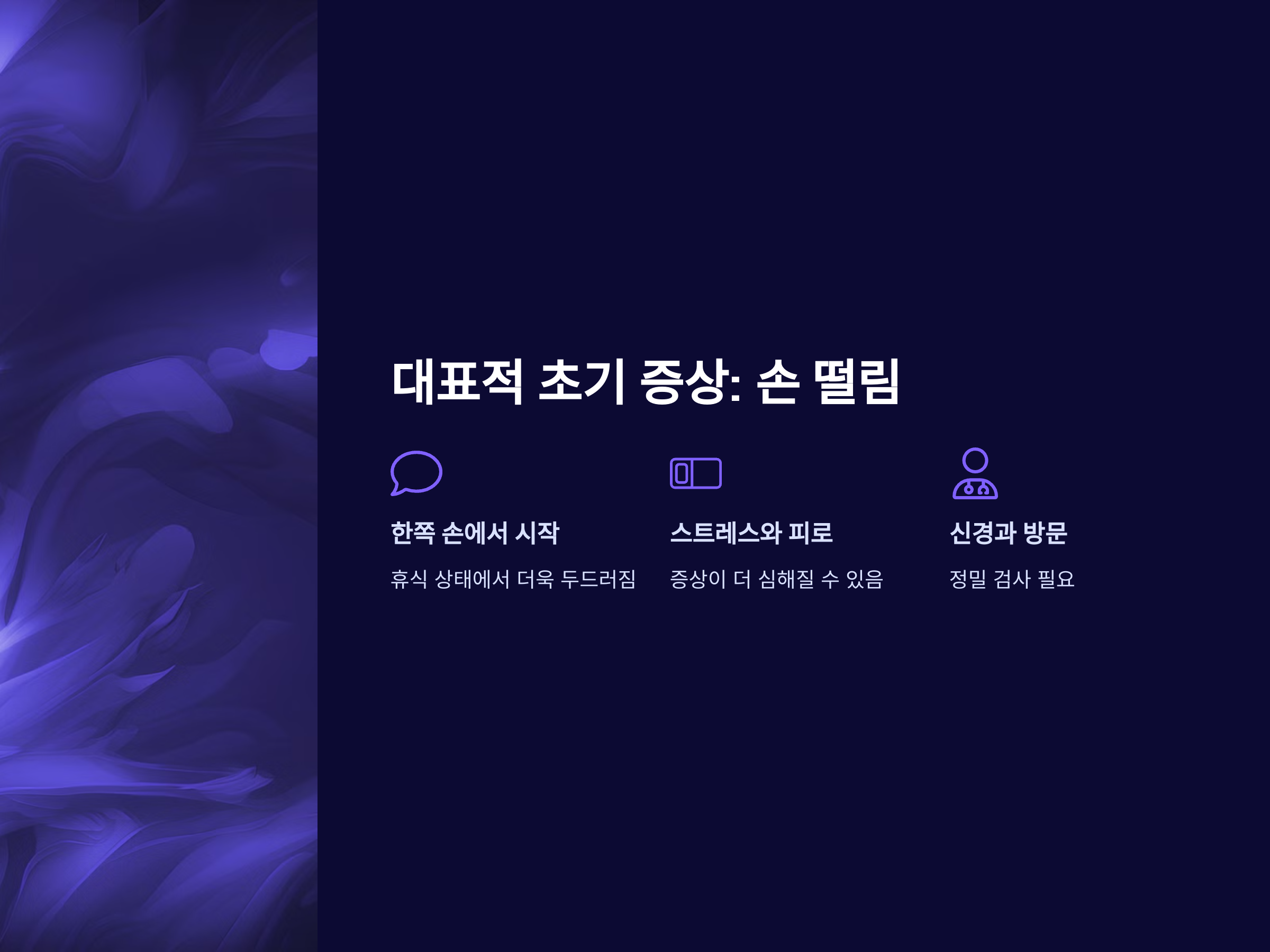 - 손 떨림은 초기에 한쪽 손에서 시작하지만, 병이 진행됨에 따라 반대쪽 손과 다리에도 영향을 미칠 수 있습니다.