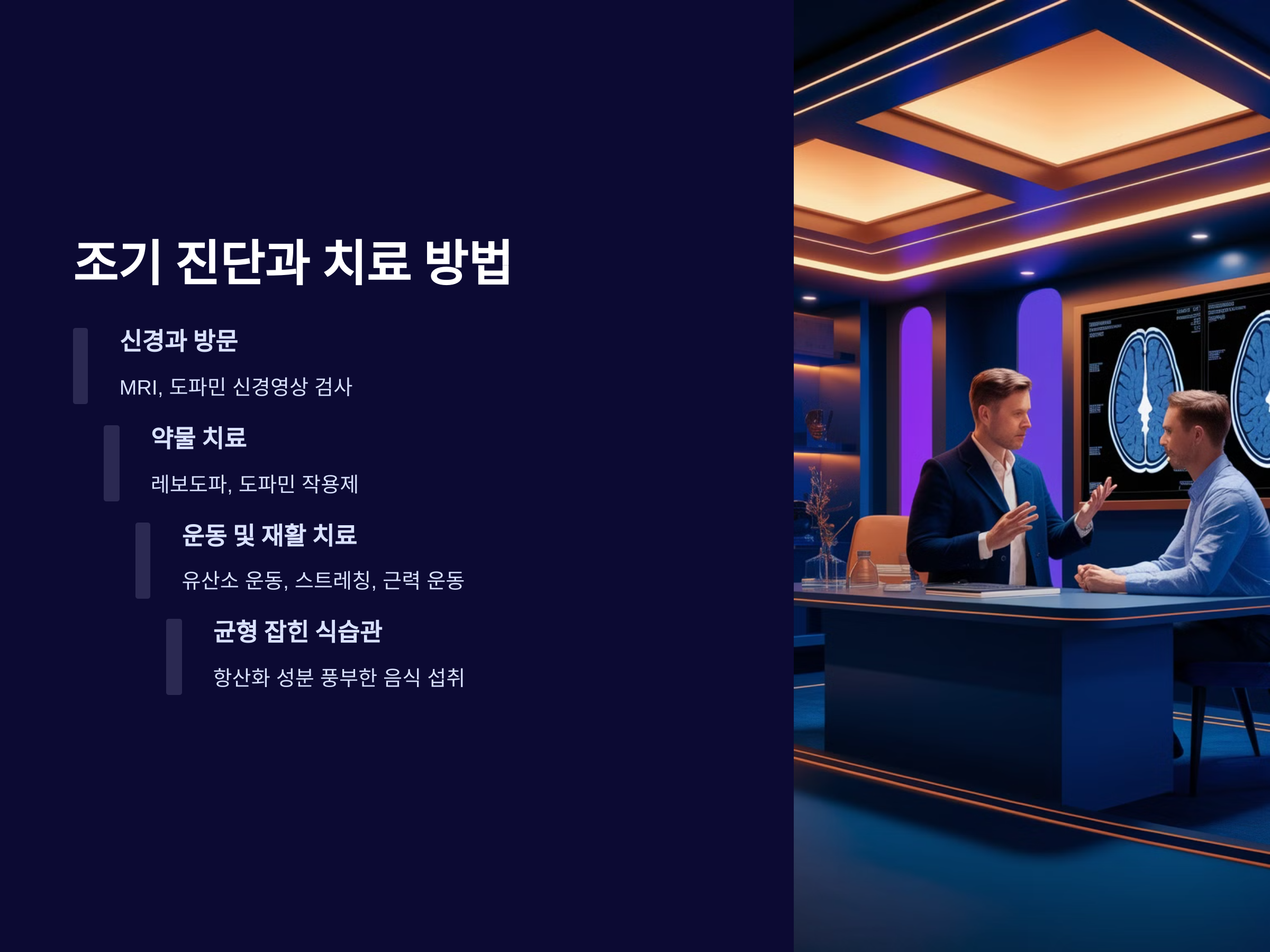 - 신경과 방문 및 정밀 검사: MRI, 도파민 신경영상 검사 등을 통해 정확한 진단을 받을 수 있습니다.
