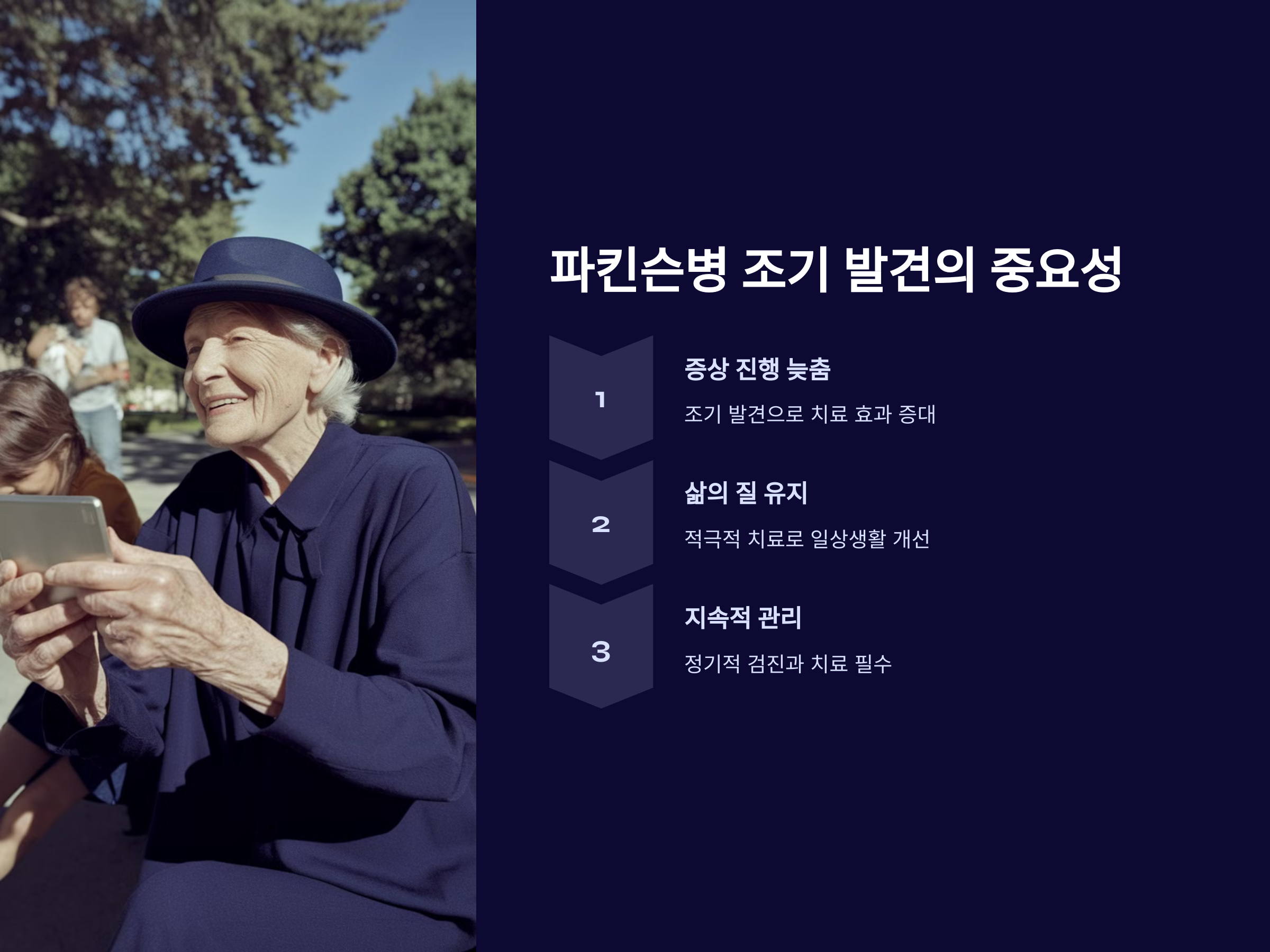 파킨슨병은 조기에 발견할수록 증상 진행을 늦추고 삶의 질을 유지할 가능성이 높아집니다.