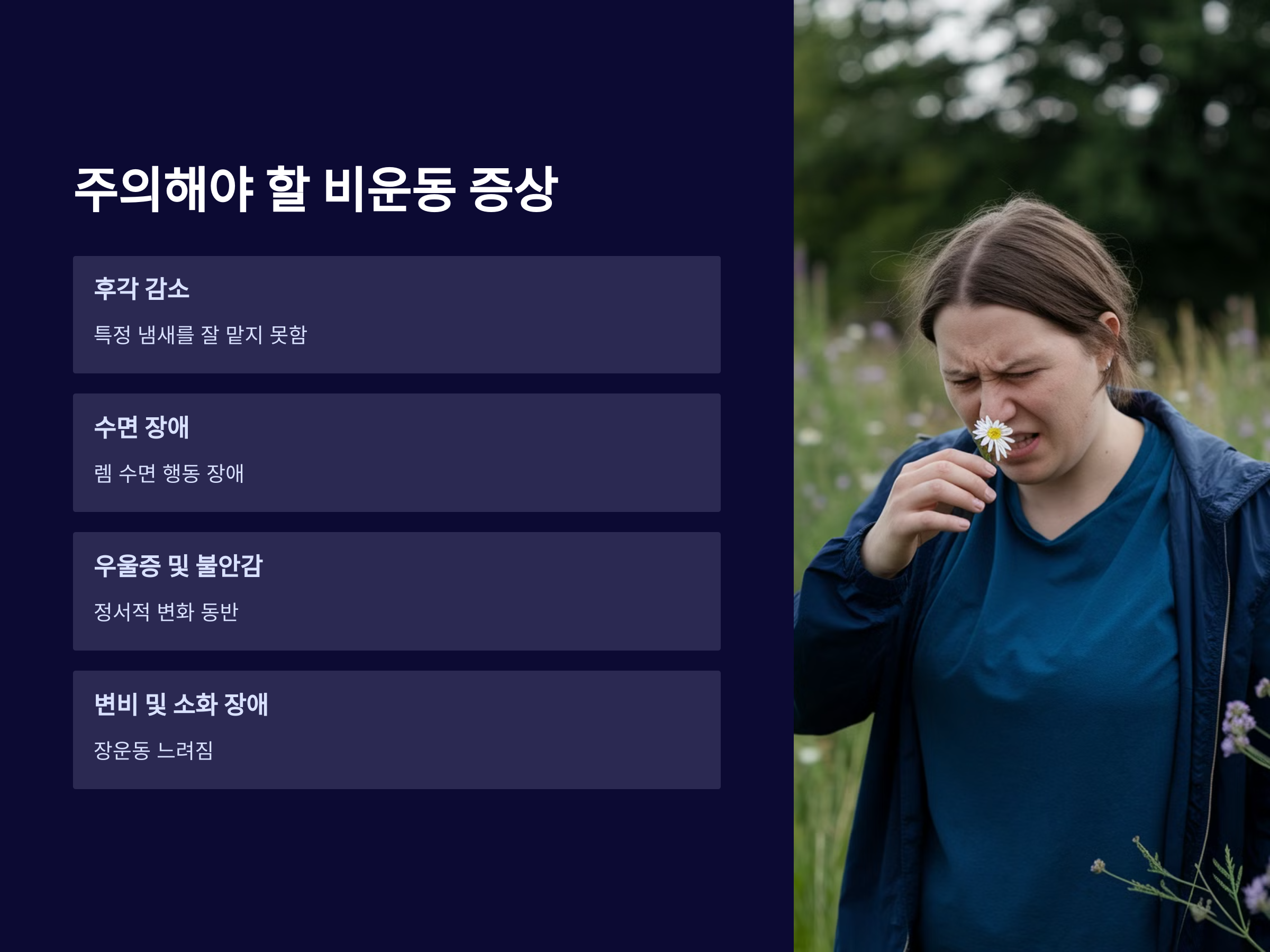 이러한 비운동 증상은 초기부터 나타날 수 있기 때문에, 미묘한 변화라도 놓치지 않고 신경과 전문의와 상담하는 것이 중요합니다.