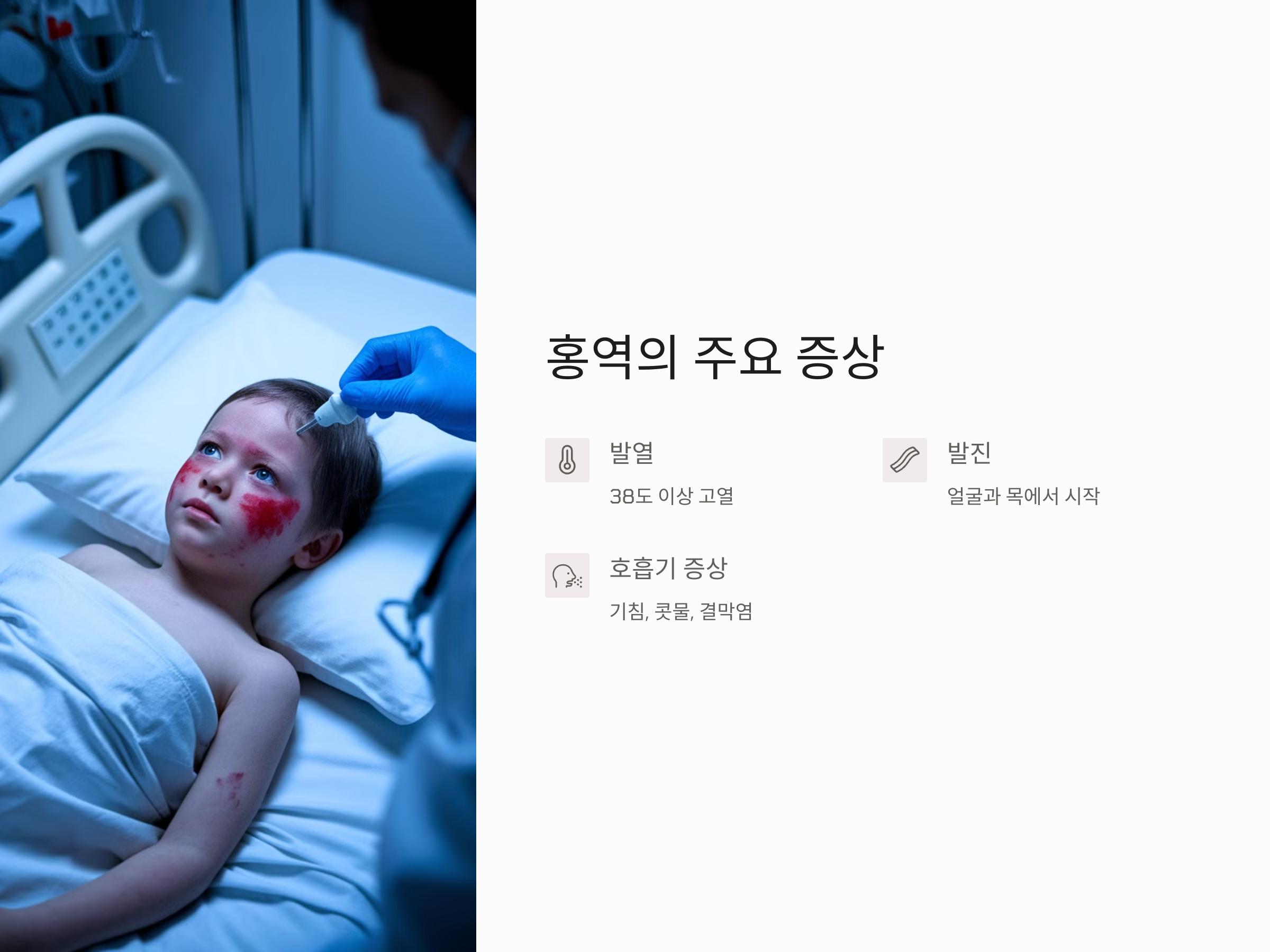 홍역의 주요 증상으로는 발열, 발진, 기침, 콧물, 결막염 등이 있습니다. 초기에는 발열이 먼저 시작되며, 체온이 38도 이상으로 올라가고, 전신적인 불쾌감이 동반됩니다. 또한, 기침과 콧물이 나타나며, 결막염으로 인해 눈이 충혈되고 아플 수 있습니다.