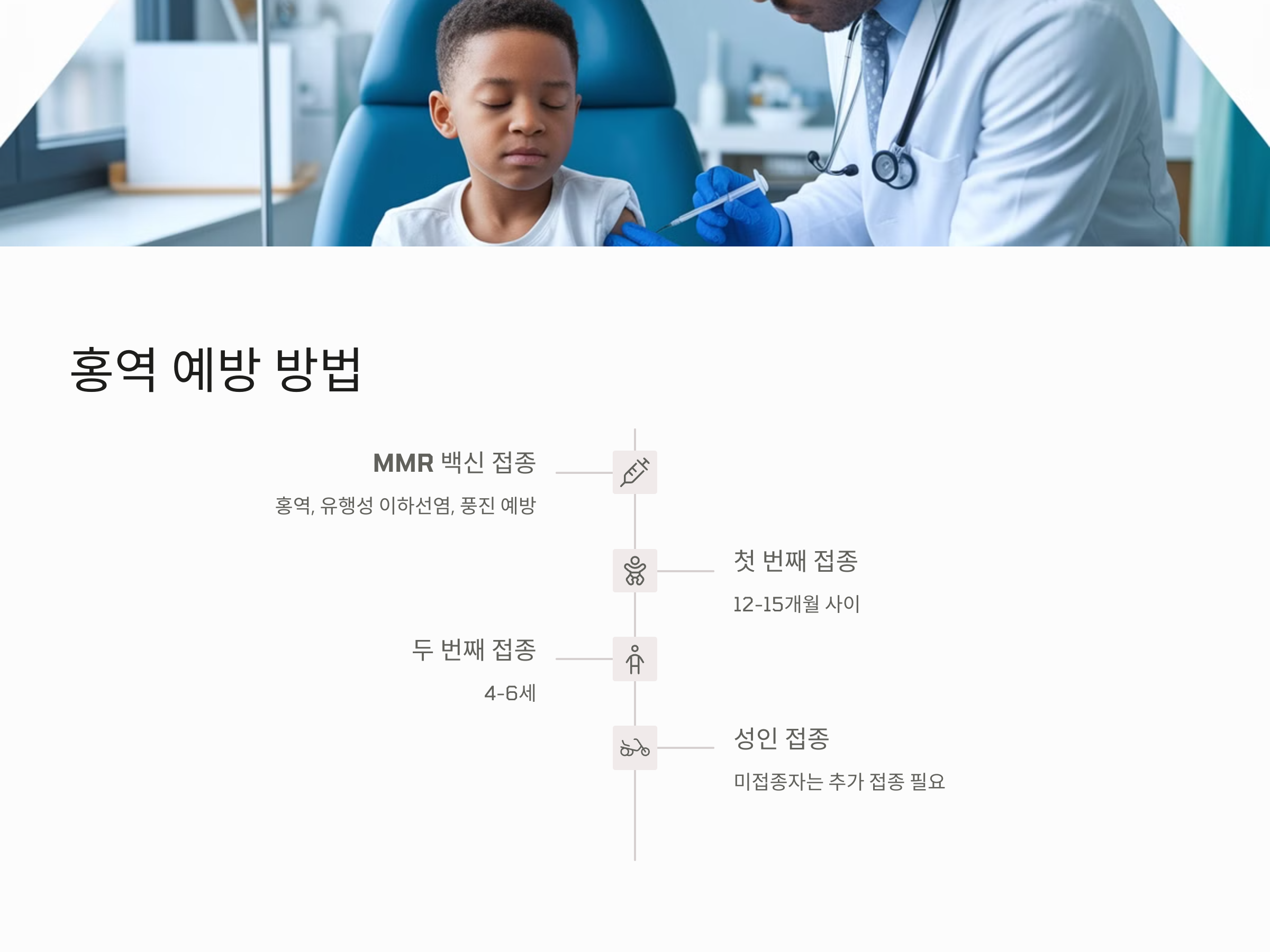 홍역의 예방은 예방접종을 통해 가능합니다. 홍역 예방접종은 MMR 백신(Mumps, Measles, Rubella 백신)으로, 홍역, 유행성 이하선염, 풍진을 예방할 수 있습니다. 대부분의 국가에서 어린이에게 MMR 백신을 접종하도록 권장하고 있으며, 접종 후에는 평생 면역력이 형성되는 경우가 많습니다.
