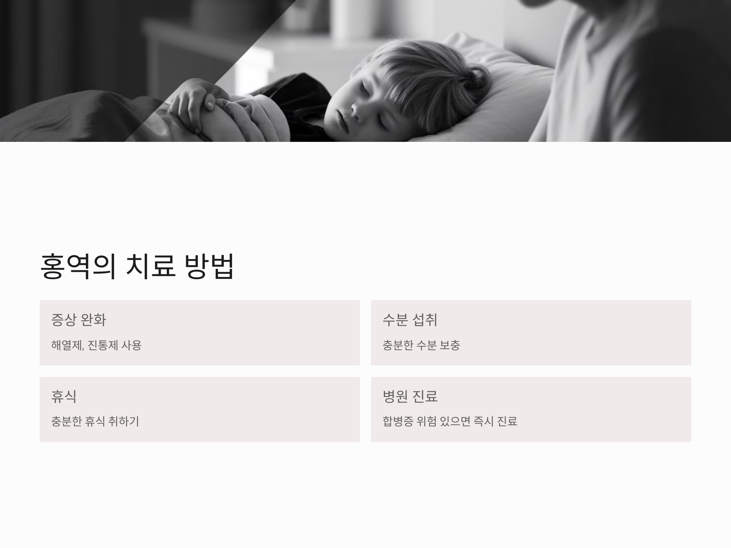 홍역은 현재 특정한 치료제가 없는 질환입니다. 치료는 주로 증상을 완화하는 방법으로 이루어집니다. 발열과 통증을 완화하기 위해 해열제나 진통제를 사용할 수 있으며, 기침이나 콧물 증상이 있을 경우, 이를 완화하는 약물이 처방될 수 있습니다. 또한, 수분 섭취를 충분히 하고, 휴식을 취하는 것이 회복에 도움이 됩니다.