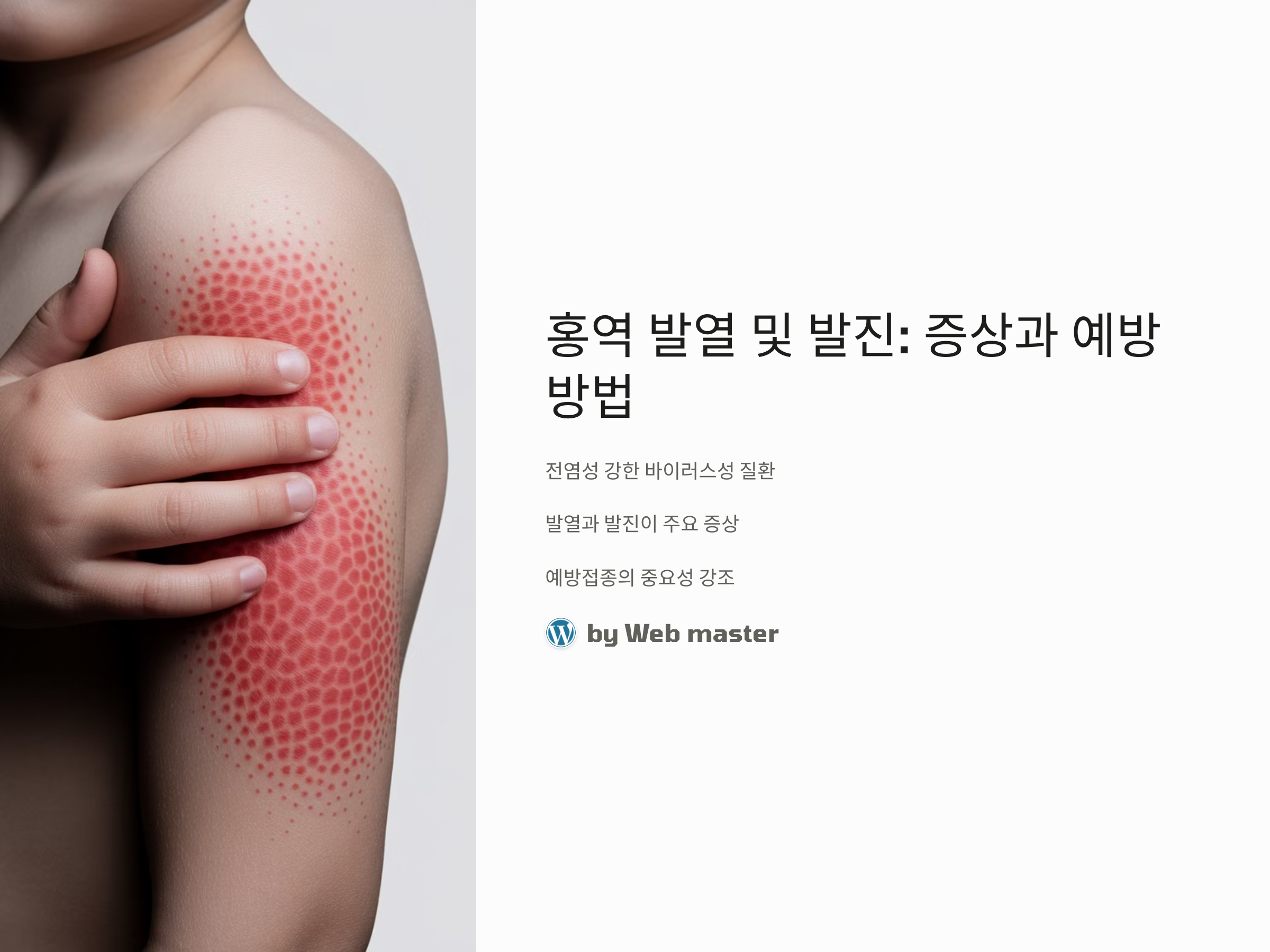 홍역은 전염성이 매우 강한 질환으로, 예방접종을 통해 충분히 예방할 수 있습니다. 발열과 발진이 나타날 때에는 병원에서 진단을 받고, 증상을 완화하는 치료를 받는 것이 중요합니다. 홍역을 예방하기 위한 가장 좋은 방법은 MMR 백신을 접종하는 것이며, 이를 통해 홍역의 확산을 막을 수 있습니다. 따라서, 홍역 예방을 위한 백신 접종은 매우 중요한 건강 관리 중 하나입니다.