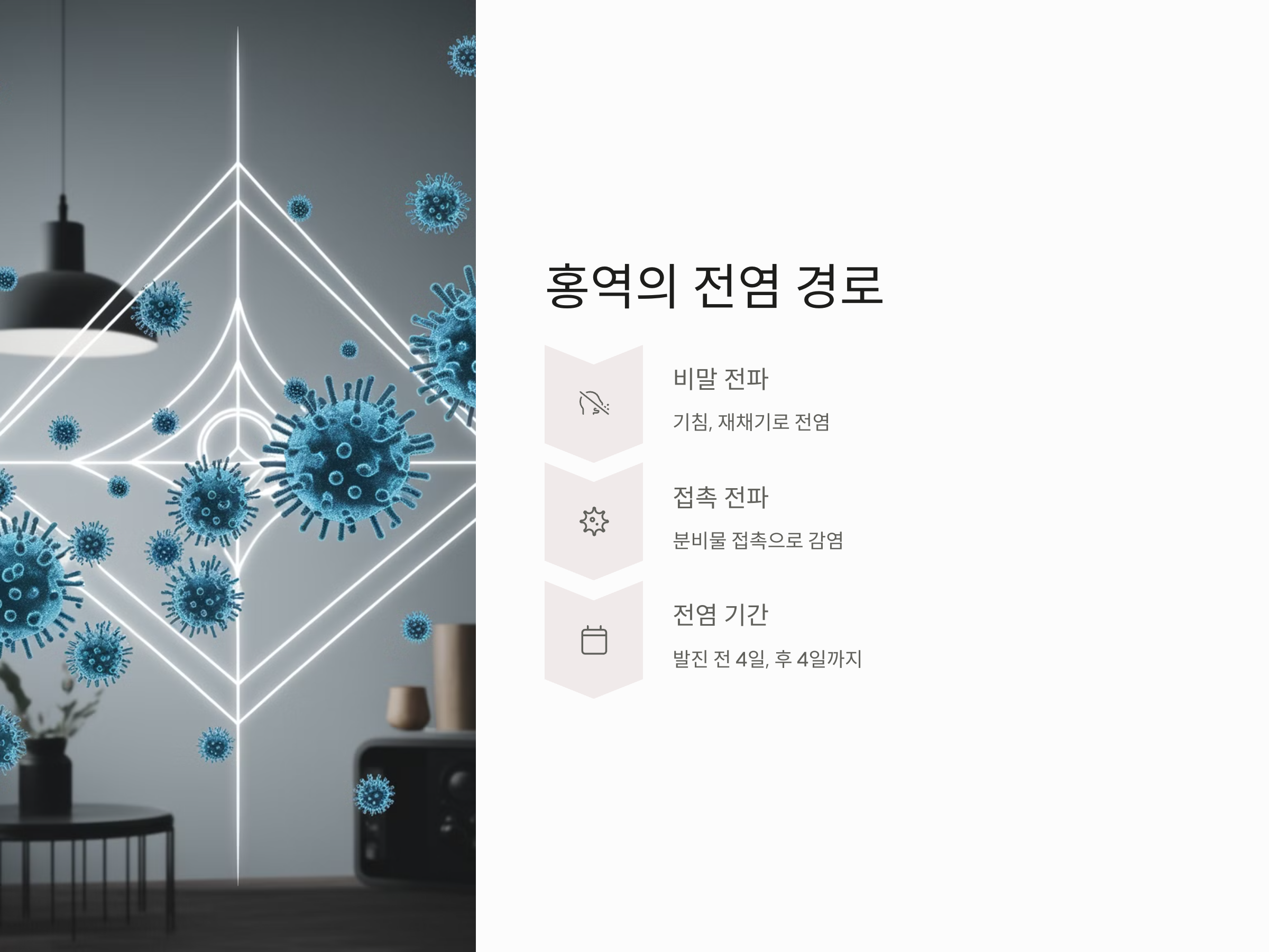 홍역은 공기를 통해 전염되는 질병으로, 감염된 사람이 기침이나 재채기를 할 때 발생하는 비말로 인해 쉽게 퍼질 수 있습니다. 또한, 감염된 사람의 침이나 코에서 나오는 분비물과 접촉을 통해 전염되기도 합니다. 홍역은 매우 전염성이 강하므로, 감염된 사람이 있는 환경에서는 주의가 필요합니다.