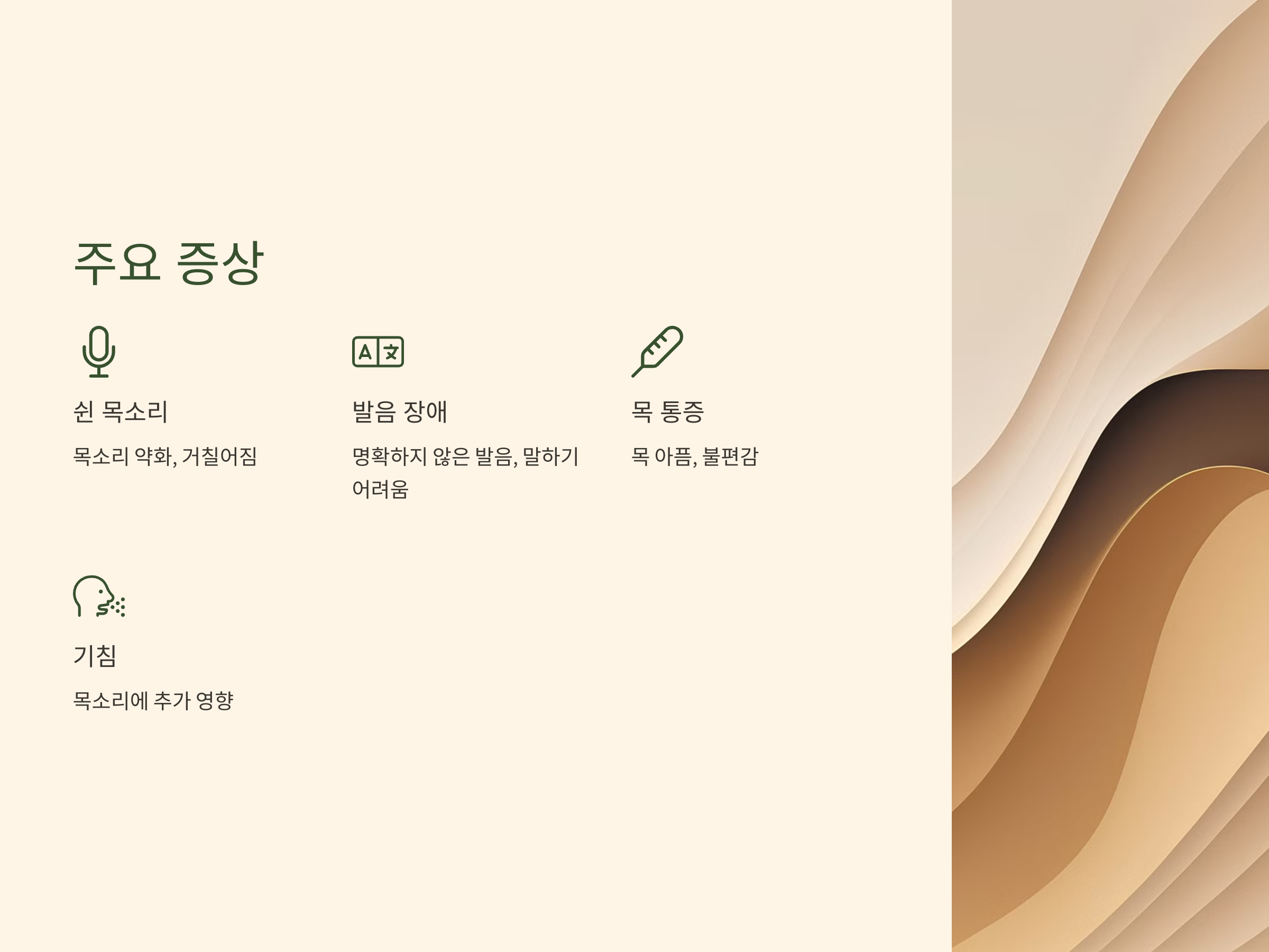 - 쉰 목소리: 후두염이 발생하면 목소리가 쉰 상태가 됩니다. 목소리가 약해지거나, 부드럽게 나오지 않거나, 거칠게 들리기도 합니다.