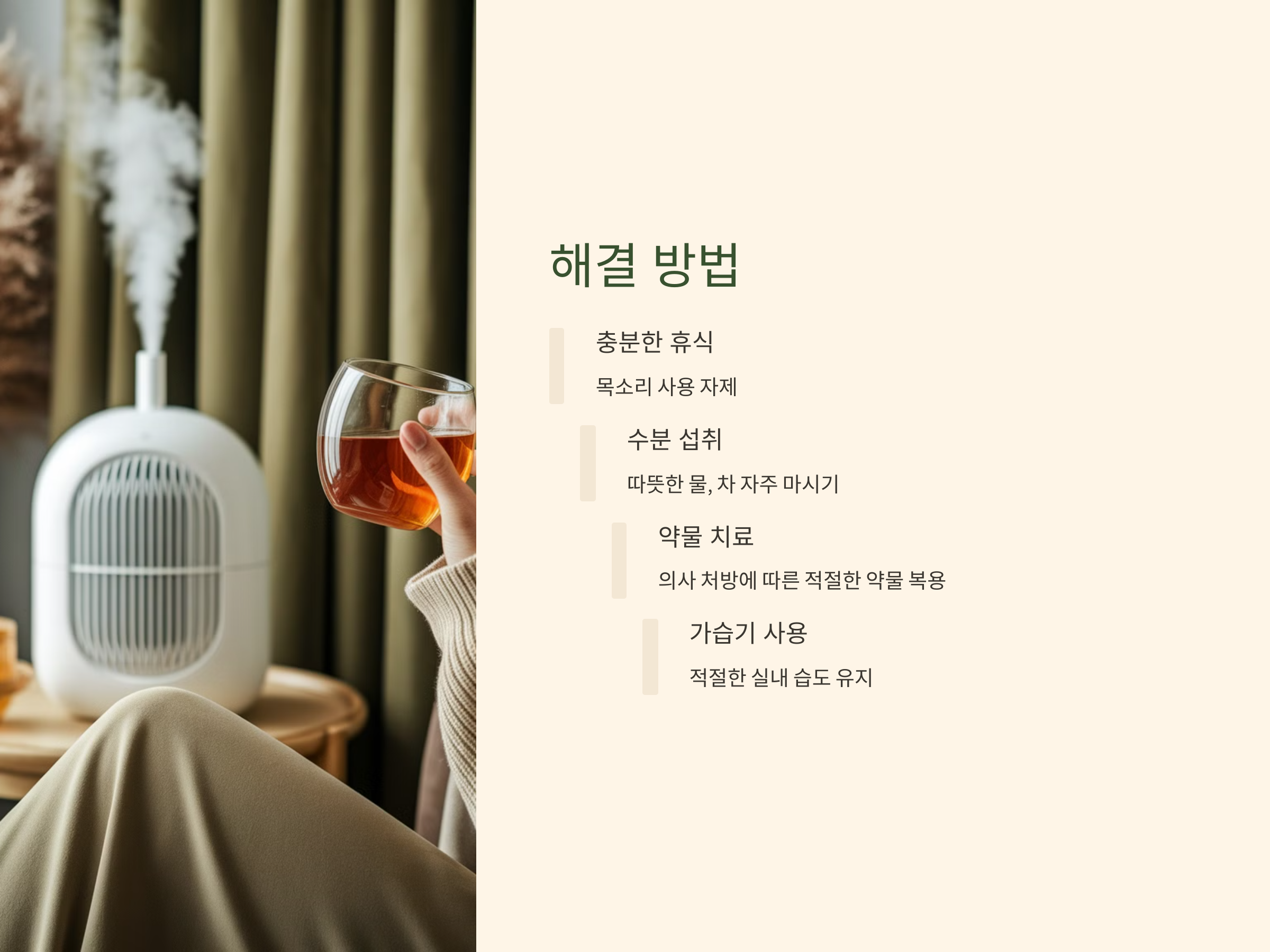 후두 감염으로 인한 쉰 목소리나 발음 장애를 해결하기 위해서는 적절한 치료와 관리가 필요합니다. 다음은 효과적인 해결 방법입니다.