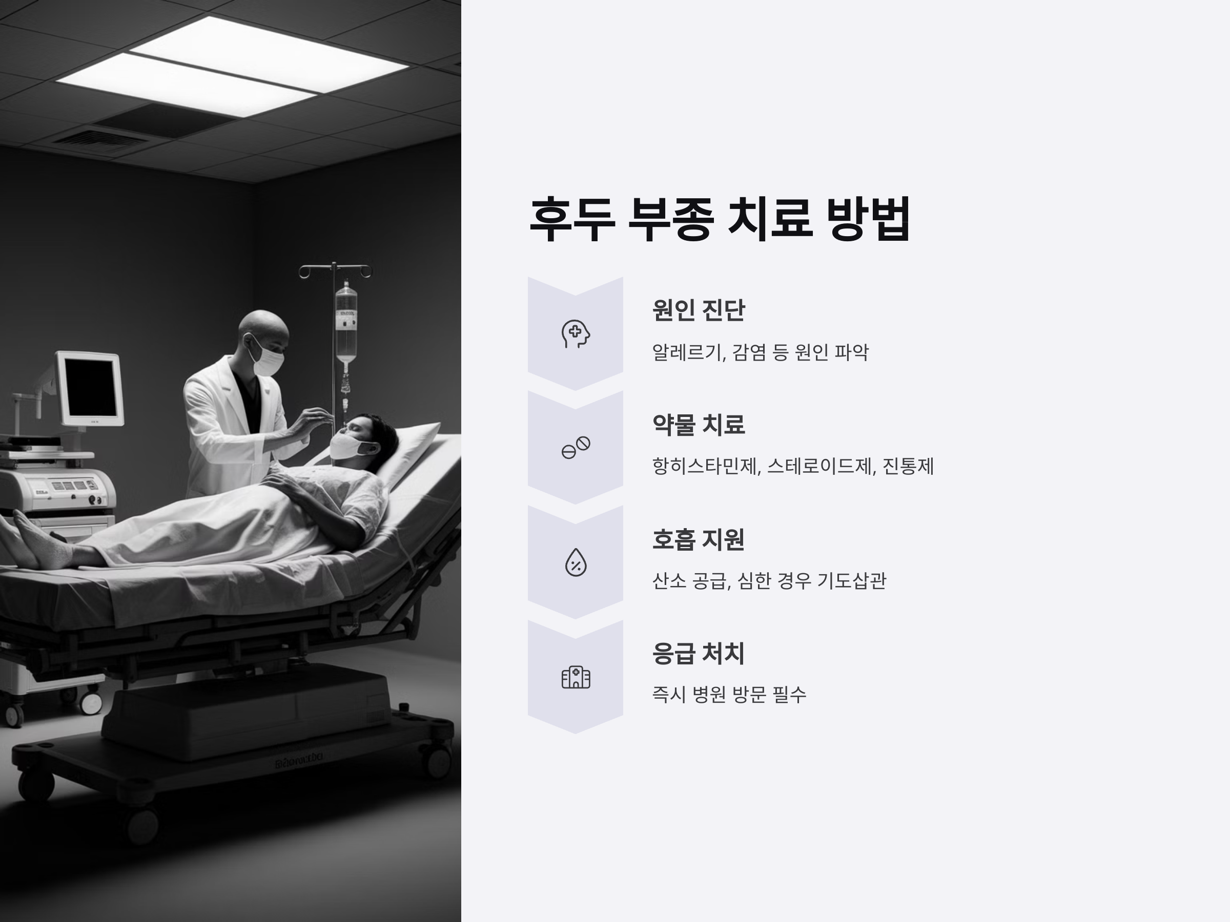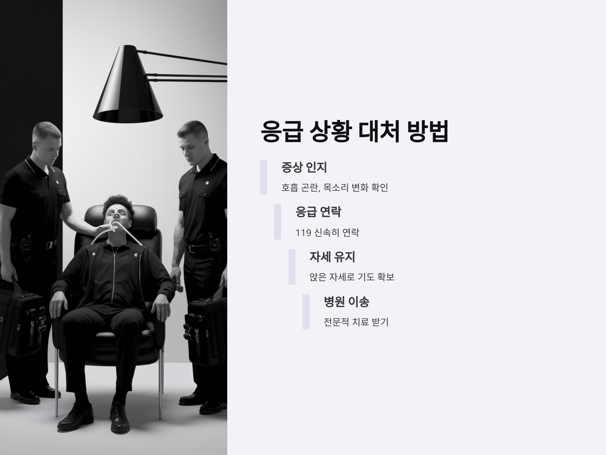 호흡 곤란이 심해질 경우에는 산소 공급이나 인공호흡이 필요할 수 있습니다. 심한 경우에는 기도삽관을 통해 기도를 확보하는 등의 응급처치가 필요할 수 있습니다. 따라서, 후두 부종이 의심되면 즉시 병원을 찾아 진료를 받는 것이 중요합니다.