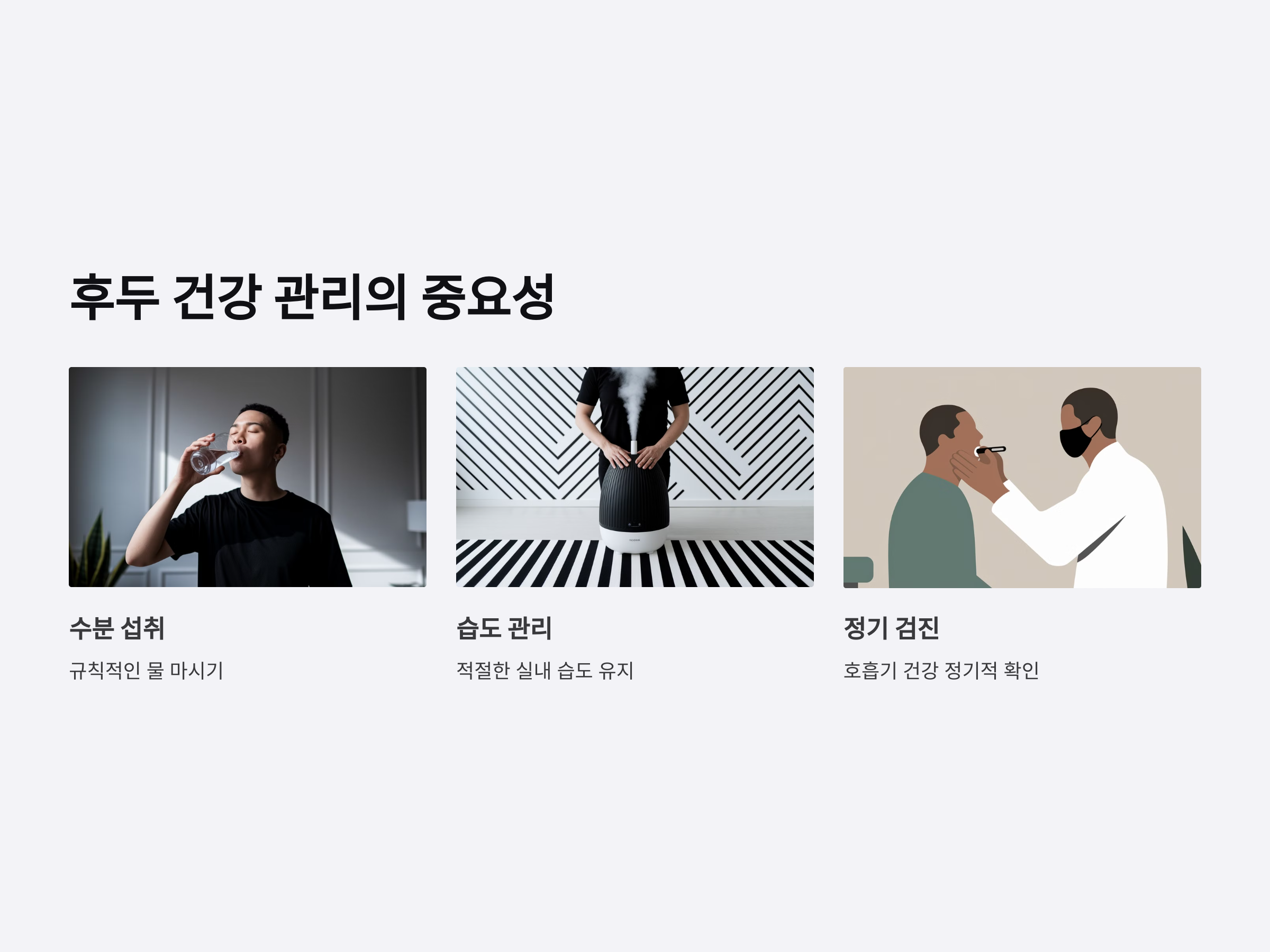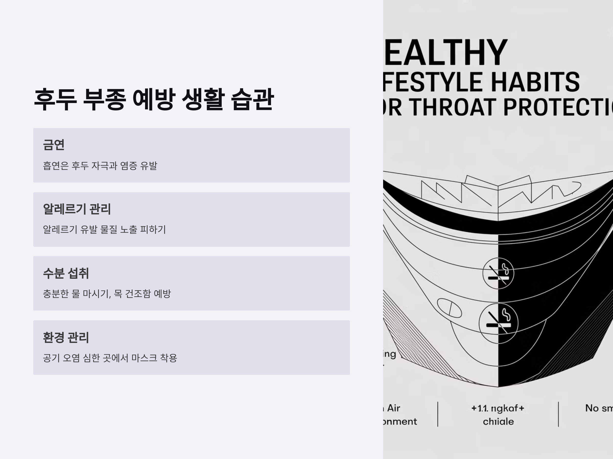 셋째, 적절한 수분 섭취와 휴식이 필요합니다. 목의 건조함을 예방하기 위해 충분히 물을 마시고, 과도한 음성 사용을 피하는 것이 좋습니다. 또한, 공기 오염이 심한 환경에서는 마스크를 착용하여 호흡기를 보호하는 것도 좋은 예방책입니다.