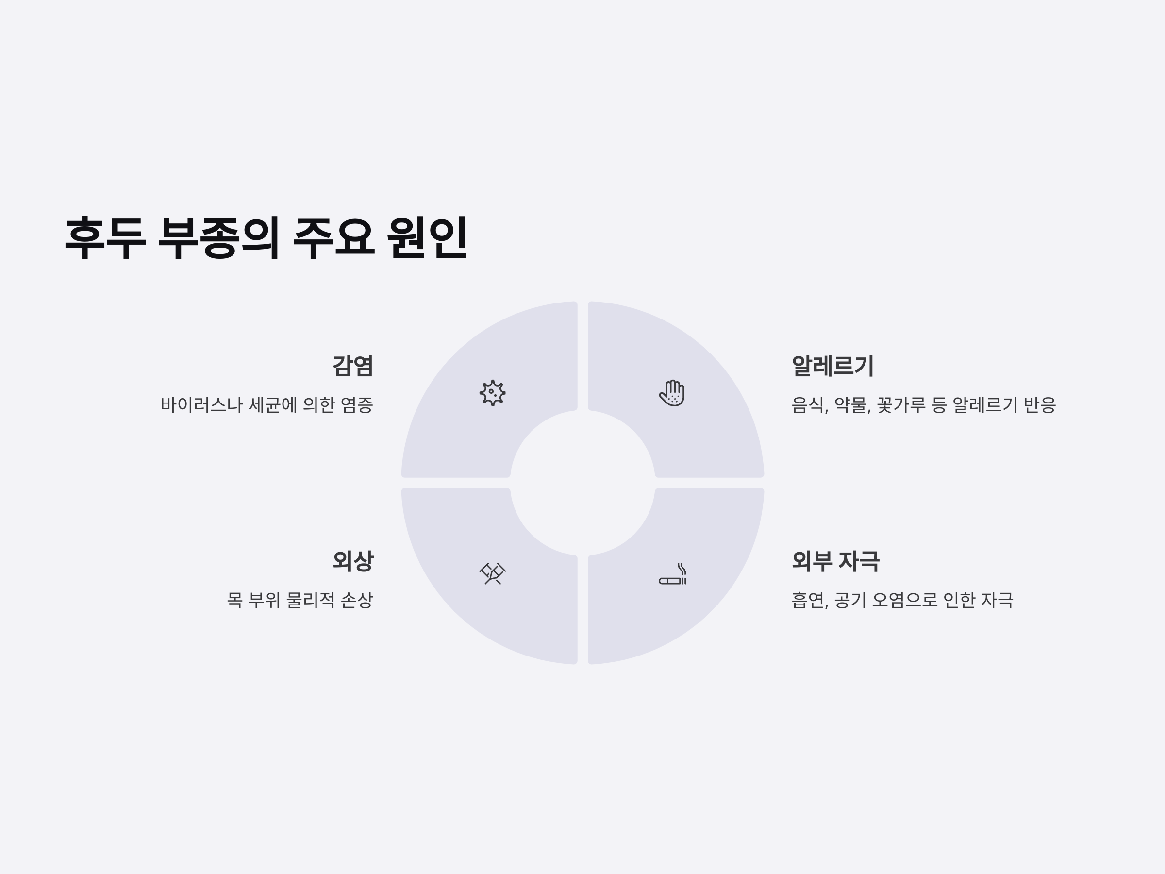 후두 부종은 여러 가지 원인으로 발생할 수 있습니다. 가장 흔한 원인으로는 감염이 있습니다. 감염은 바이러스나 세균에 의해 후두에 염증을 일으킬 수 있으며, 이로 인해 부종이 생깁니다. 또한 알레르기 반응도 후두 부종을 유발할 수 있습니다. 음식, 약물, 꽃가루 등 다양한 알레르기 유발 물질이 후두에 영향을 미쳐 염증과 부종을 일으킬 수 있습니다.