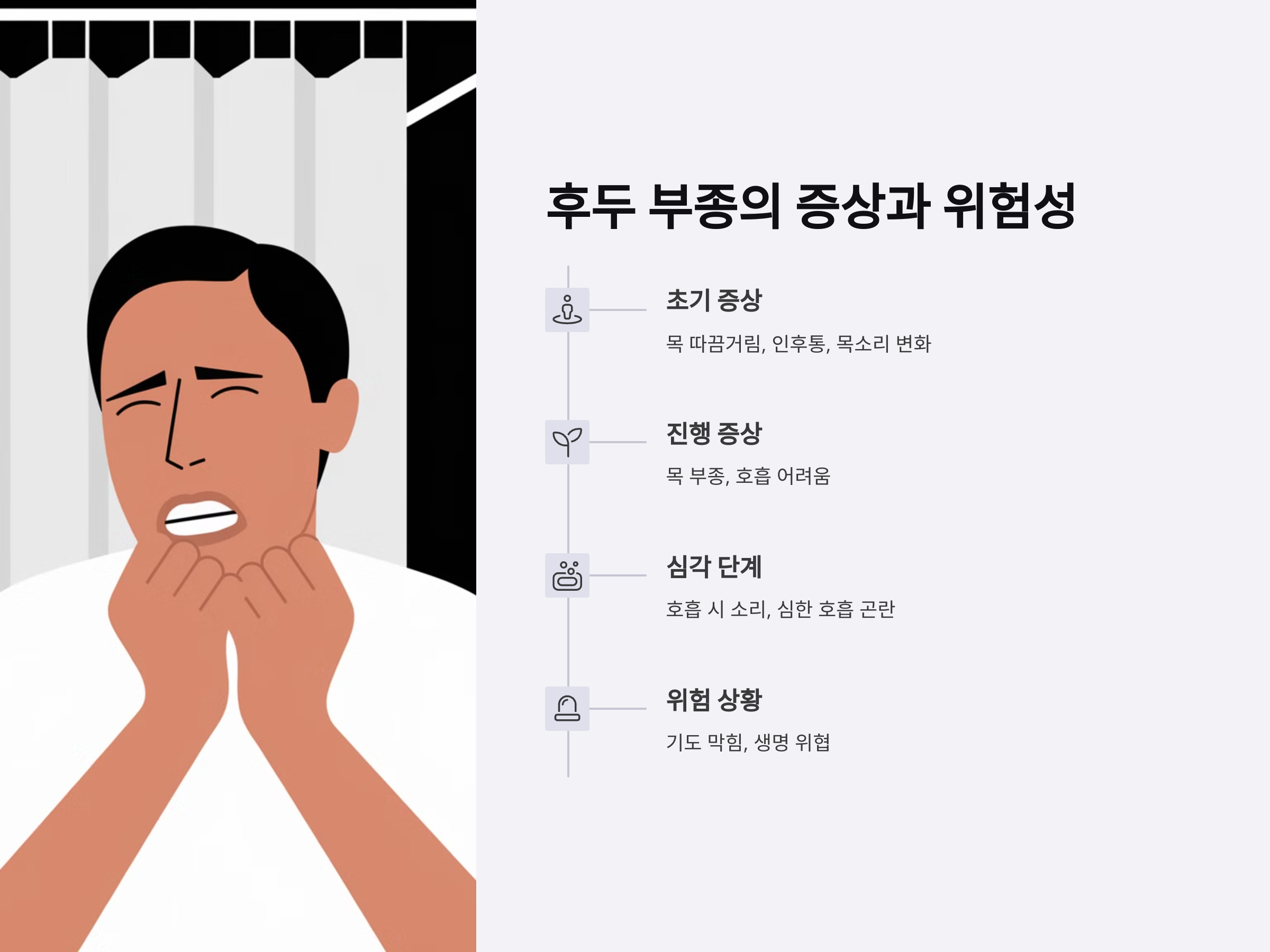 후두 부종의 증상은 급격하게 나타날 수 있으며, 심각한 경우 호흡 곤란을 초래할 수 있습니다. 초기 증상으로는 목이 따끔거리거나, 가벼운 인후통과 함께 목소리가 쉬는 증상이 나타날 수 있습니다. 이후 점차적으로 목이 붓고, 호흡이 어려워지며, 호흡 시 소리가 나는 경우가 많습니다.