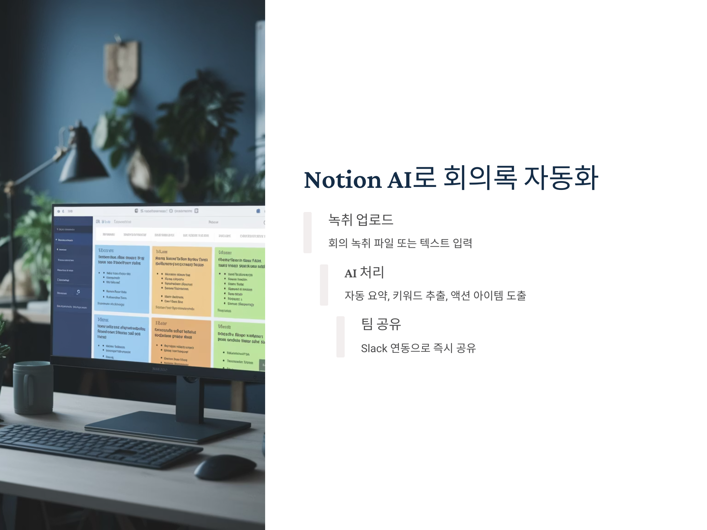 회의록 작성은 항상 귀찮고 반복적인 작업입니다. 하지만 회의는 필수이고, 기록은 남겨야 하죠. 여기서 Notion AI의 자동 회의록 기능이 빛을 발합니다. 회의 녹취 파일을 업로드하거나, 회의 내용 텍스트를 입력하면 Notion이 AI 기반 요약, 키워드 추출, 액션 아이템 도출까지 자동으로 처리해줍니다.