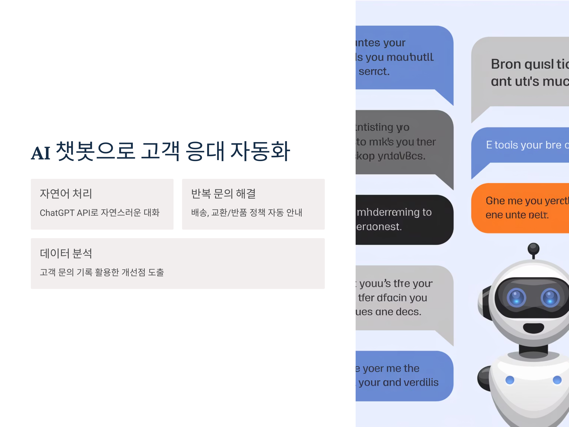 예를 들어, 쇼핑몰 운영자가 배송문의, 교환/반품 정책 등을 자동화된 챗봇으로 처리하게 되면, 고객만족도는 물론이고 운영자 입장에서도 반복 문의에 소모되는 에너지를 줄일 수 있습니다. 또한 고객 문의 기록을 분석해 상품 개선과 마케팅에도 활용할 수 있어 1석 3조입니다.