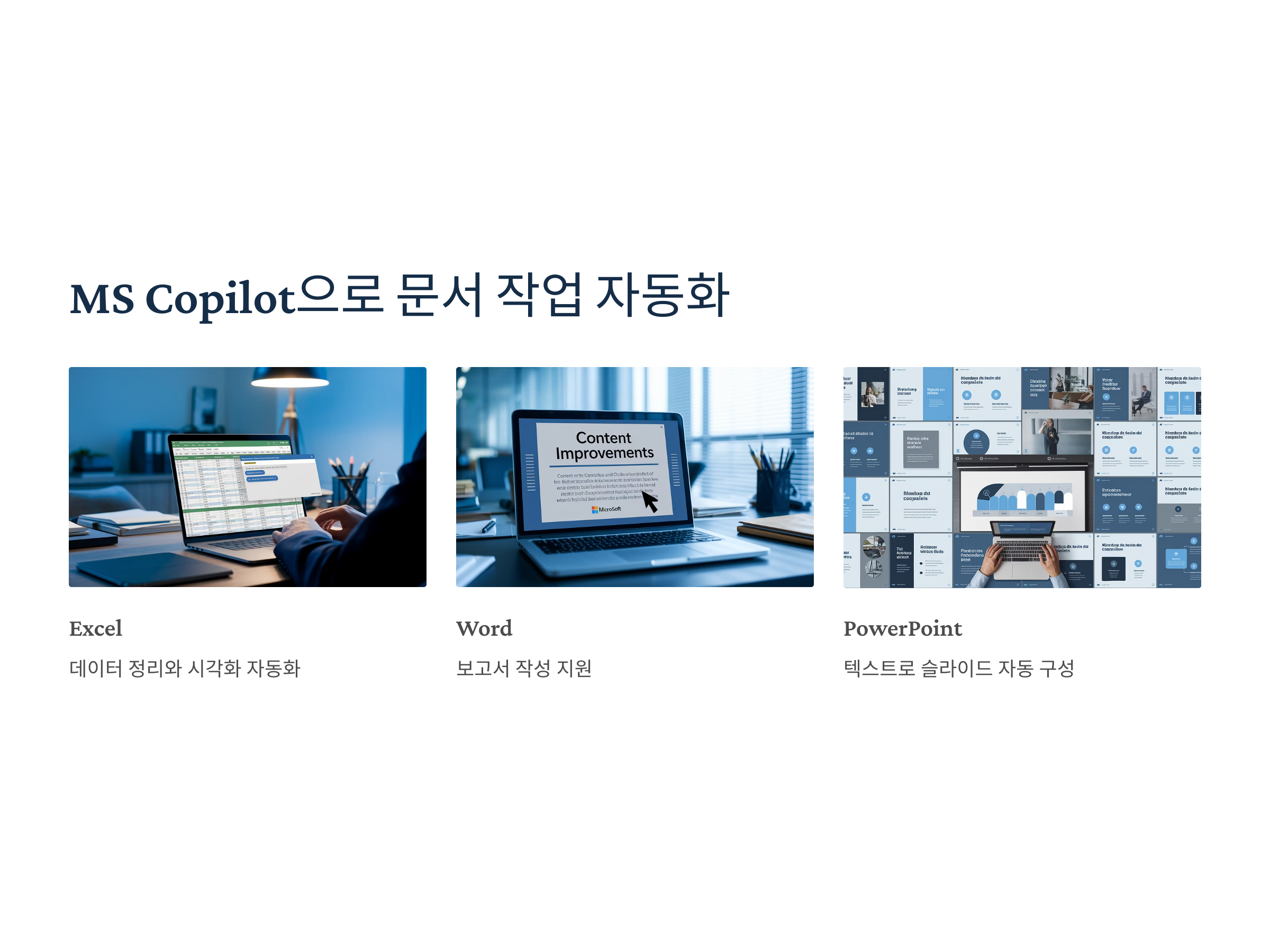 Copilot의 장점은 기존의 Office 환경을 그대로 유지하면서도 AI의 도움을 받을 수 있다는 점입니다. 익숙한 인터페이스 안에서 AI 기능을 자연스럽게 사용할 수 있어, 적응도 빠르고 활용도도 높습니다.