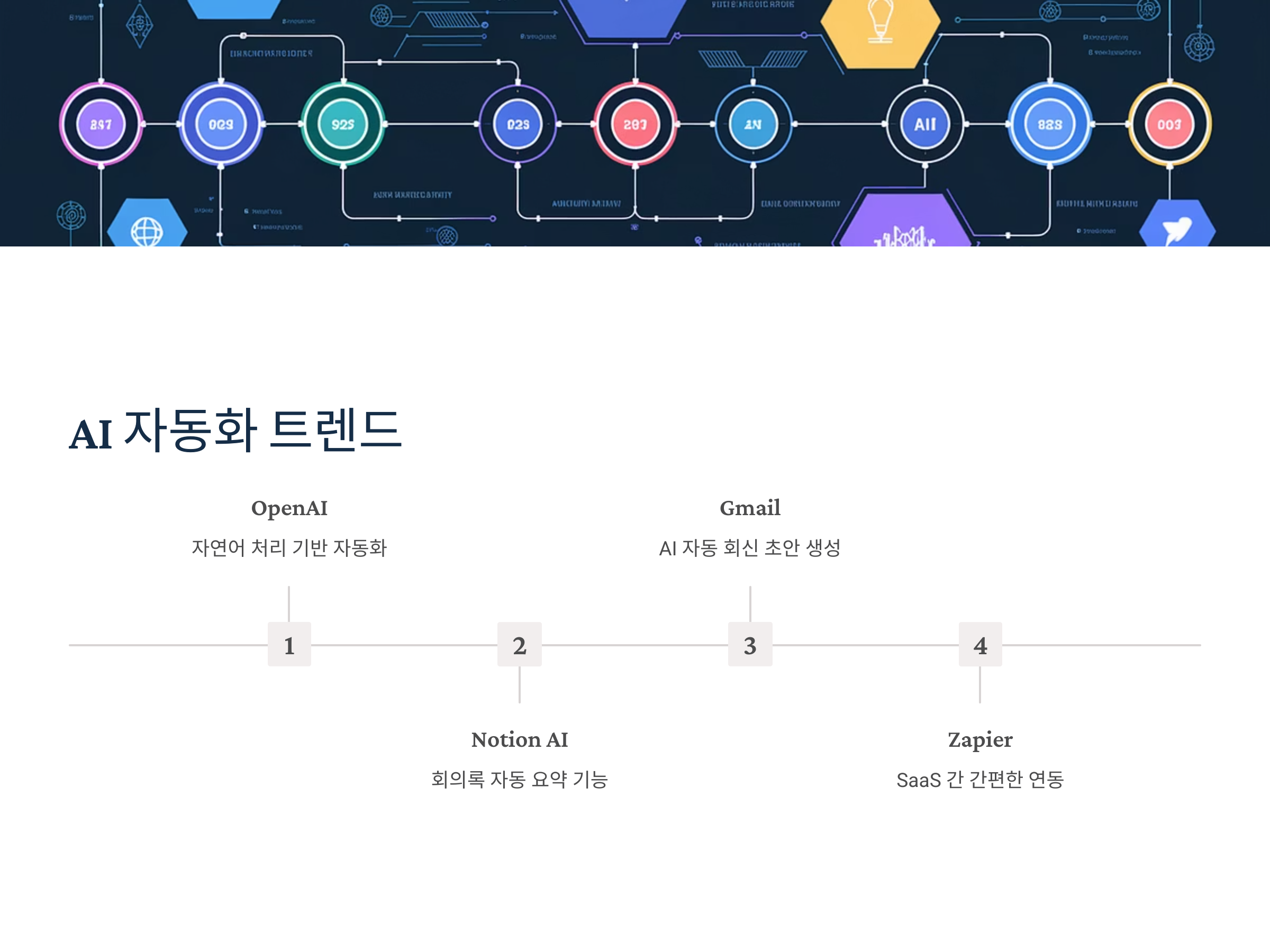 2024년 하반기부터 2025년 초까지, OpenAI, Google, Microsoft, Notion, Zapier 등 다양한 플랫폼에서 AI 기반 업무 자동화 기능이 폭발적으로 성장하고 있습니다. 예를 들어, Notion은 AI 요약 기능을 통해 회의록 작성을 자동화하고, Gmail은 AI가 자동으로 회신 초안을 생성하며, Zapier는 SaaS 간 연동을 간편하게 만들어줍니다. 이처럼 AI 자동화는 이제 전문가가 아닌 일반 직장인도 쉽게 접근할 수 있는 시대가 되었습니다. 이 흐름을 선도하고 싶은 분이라면 지금이 가장 좋은 시기입니다.