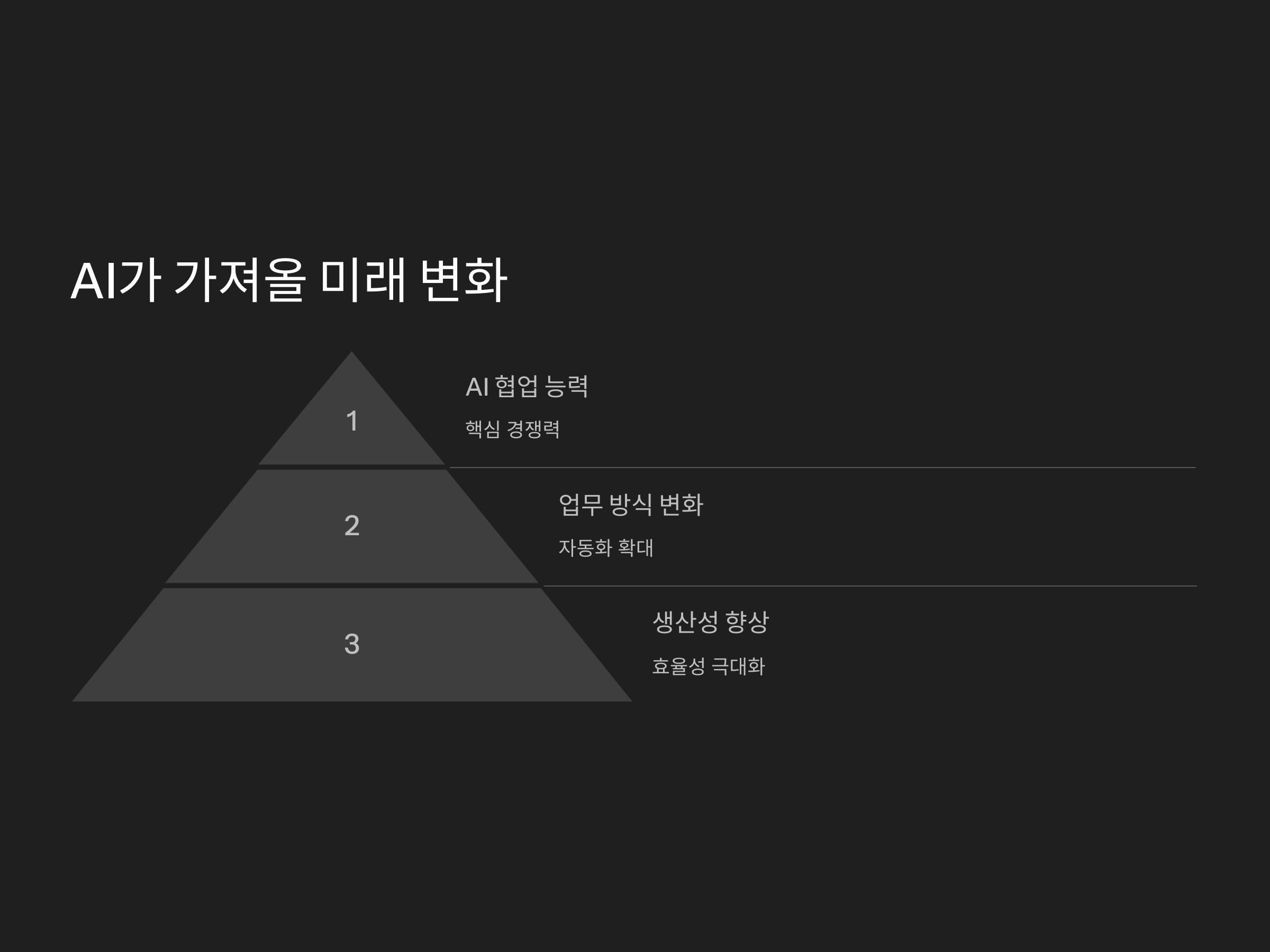 AI 기술이 발전함에 따라 우리의 일상과 업무 방식도 변화하고 있습니다. 앞으로는 AI와 협업하는 능력이 더욱 중요해질 것이며, AI 활용 능력을 갖춘 사람이 경쟁력을 가질 것입니다. 특히 AI를 활용한 자동화 및 생산성 향상이 더욱 주목받을 것입니다.