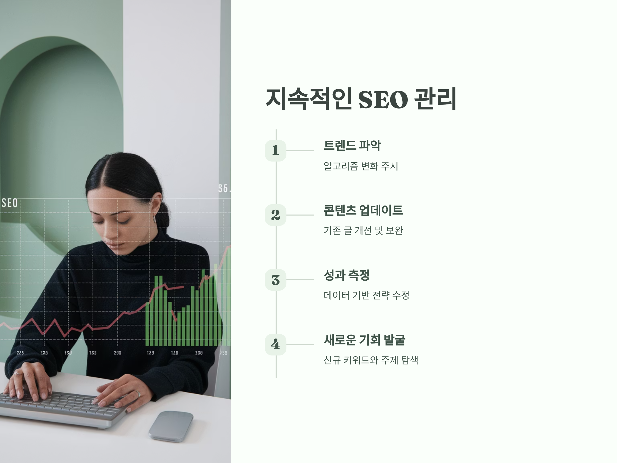 SEO 최적화는 한 번의 작업으로 끝나는 일이 아닙니다. 검색 엔진의 알고리즘은 지속적으로 변화하기 때문에, 최신 트렌드를 반영하여 SEO 전략을 꾸준히 업데이트해야 합니다. 또한, 검색 결과에서 상위에 노출되기 위해서는 시간이 걸릴 수 있으므로, 끈기와 지속적인 노력이 필요합니다.