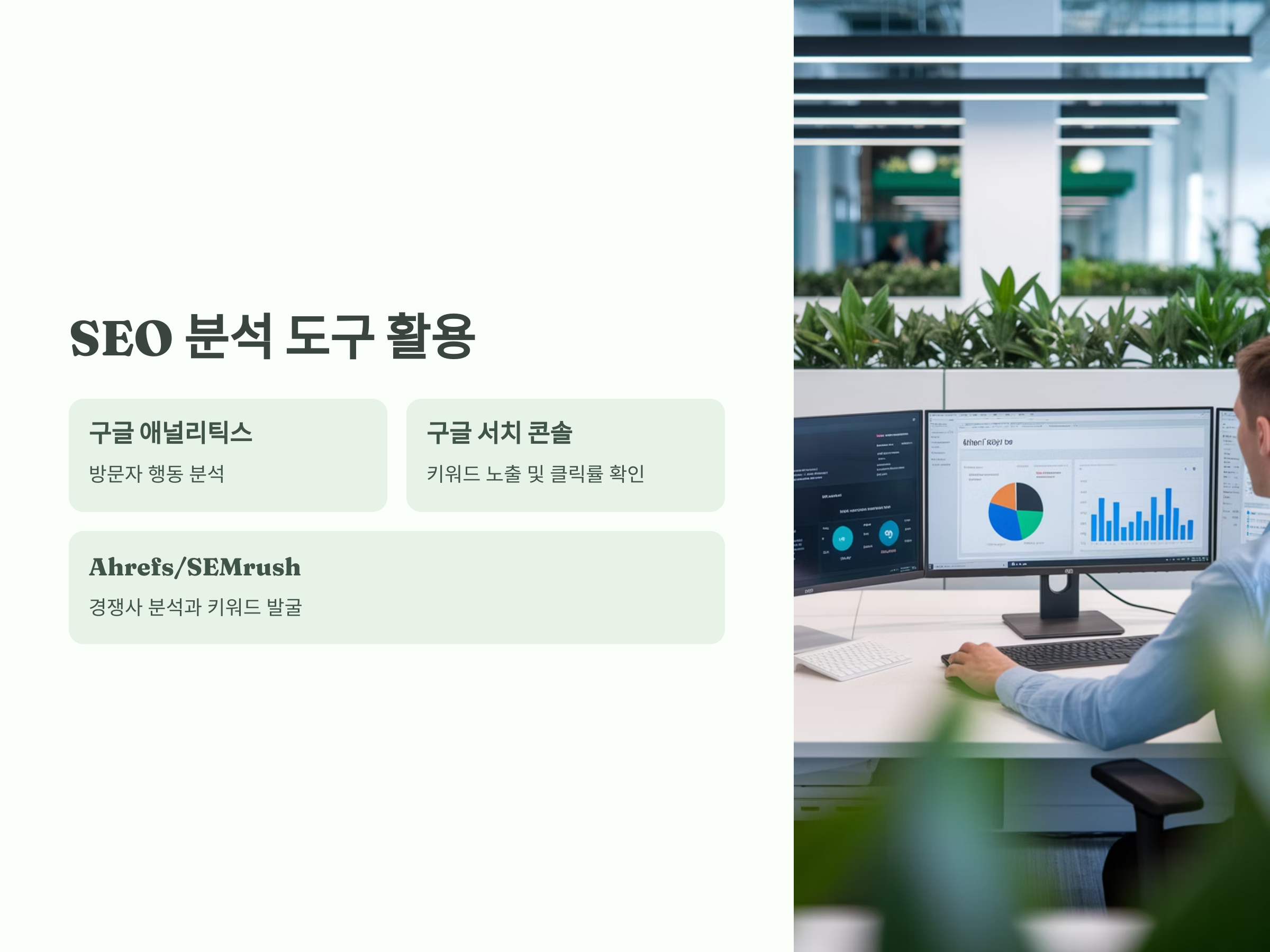 SEO를 최적화하는 과정에서 분석 도구는 중요한 역할을 합니다. 구글 애널리틱스, 구글 서치 콘솔, Ahrefs, SEMrush 등 다양한 분석 도구를 사용하여 블로그의 SEO 상태를 점검하고 개선점을 찾을 수 있습니다. 이 도구들은 검색 결과에서의 순위, 방문자 수, 클릭률, 사용자 행동 등을 분석하여 어떤 부분이 개선이 필요한지 알려줍니다.